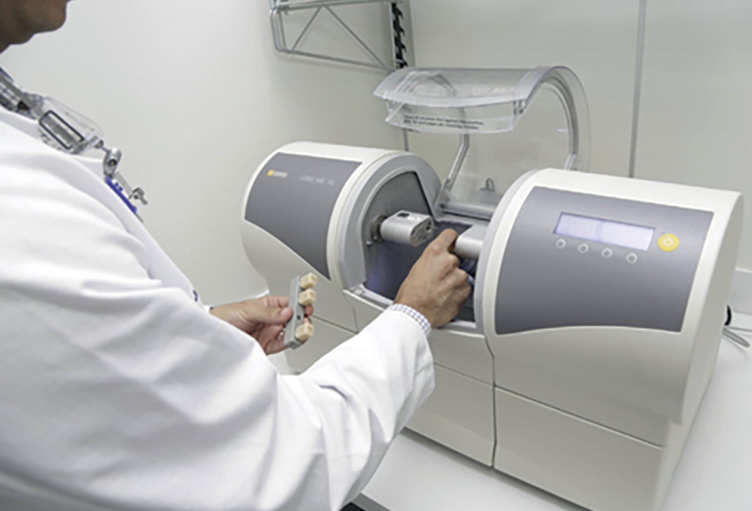 Por último, para el estudio del flujo digital está el proceso de producción o fabricación, el cual se lleva a cabo con una máquina fresadora permitiendo diseñar lo que el odontólogo indique, ya que la restauración a realizar dependerá de las necesidades del paciente al igual de la especialidad del odontólogo. Una fresadora permite crear restauraciones dentales, como son las incrustaciones, carillas, coronas, férulas oclusales, pilares/reconstrucción de implantes, etcétera. Los principales materiales que maneja este sistema son la cerámica, cromo cobalto, zirconia, resinas compuestas, titanio, PMMA (plástico termoplástico transparente), cera y PEEK (poliéter-éter-cetona).