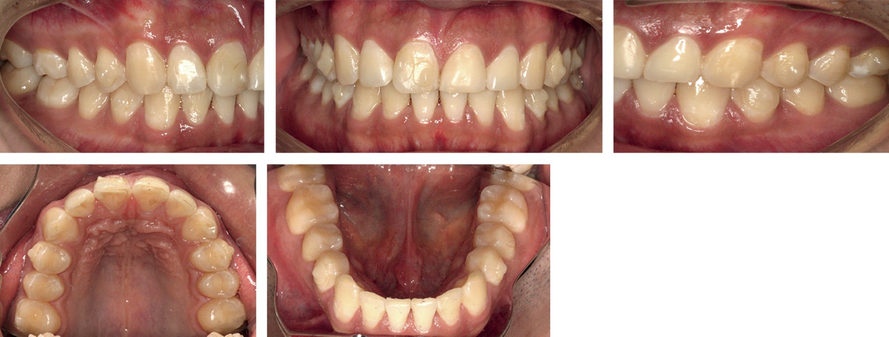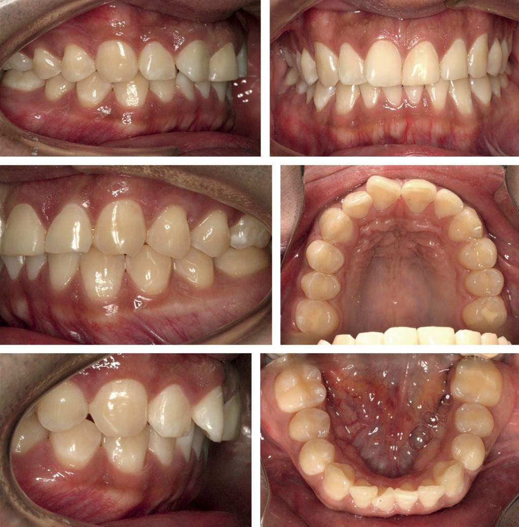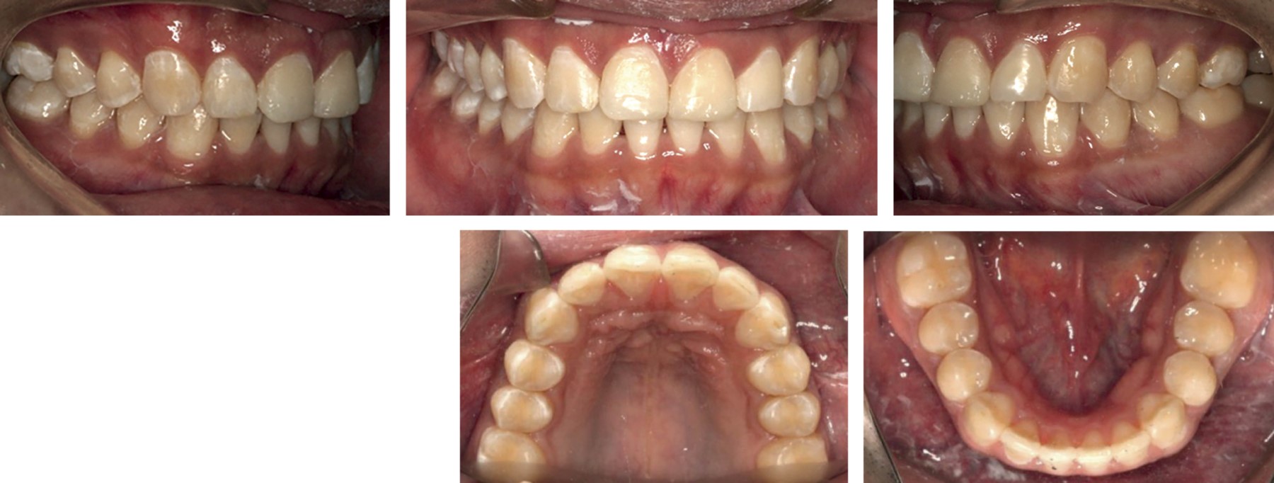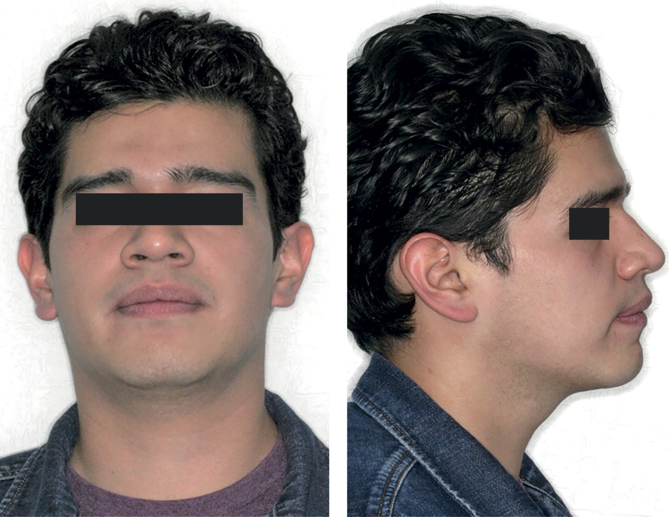 Hombre de 25 años con una relación de incisivos de clase I sobre una base esquelética I, con un ligero aumento de la altura de la cara inferior y apiñamiento moderado anterior inferior y superior ligero (Figuras 1 y 2). Motivos del tratamiento: no le gusta el apiñamiento anterior inferior y superior; no desea tratarse con aparatos fijos. Historia médica: sin anormalidades médicas relevantes detectables. Higiene bucal: buena. Patrón de tejidos blandos: labios competentes, línea normal del labio inferior y desde la lengua hasta los incisivos superiores presenta un patrón de deglución normal. Sin antecedentes de hábitos pasados. Articulación temporomandibular: no hay evidencia de signos o síntomas de disfunción de la articulación temporomandibular (ATM) ni asimetría facial considerable. Todos los dientes erupcionaron; sin embargo, presenta retención del tercer molar inferior izquierdo. En oclusión: relación de los incisivos de clase I, línea central bien alineada, sobremordida horizontal de 6 mm y vertical de 3 mm. Oclusión posterior: clase I de Angle, segmento labial superior de 7 mm, e inferior de 8 mm de apiñamiento, segmento bucal superior e inferior razonablemente bien alineados, no hay mordidas cruzadas, ni desplazamientos mandibulares. Pronóstico del tratamiento: bueno. Etiología con patrón esquelético clase I y desproporción dentoalveolar (Figura 3).