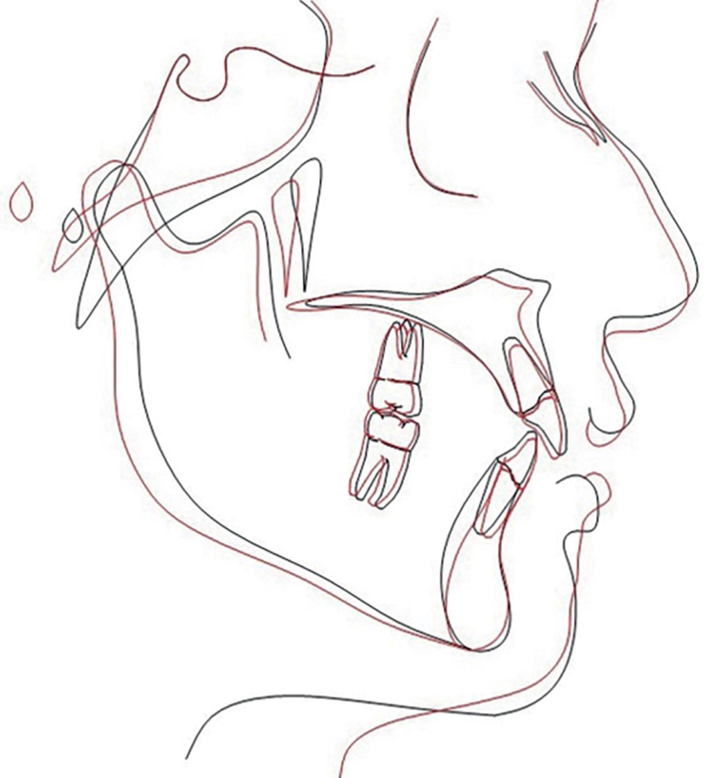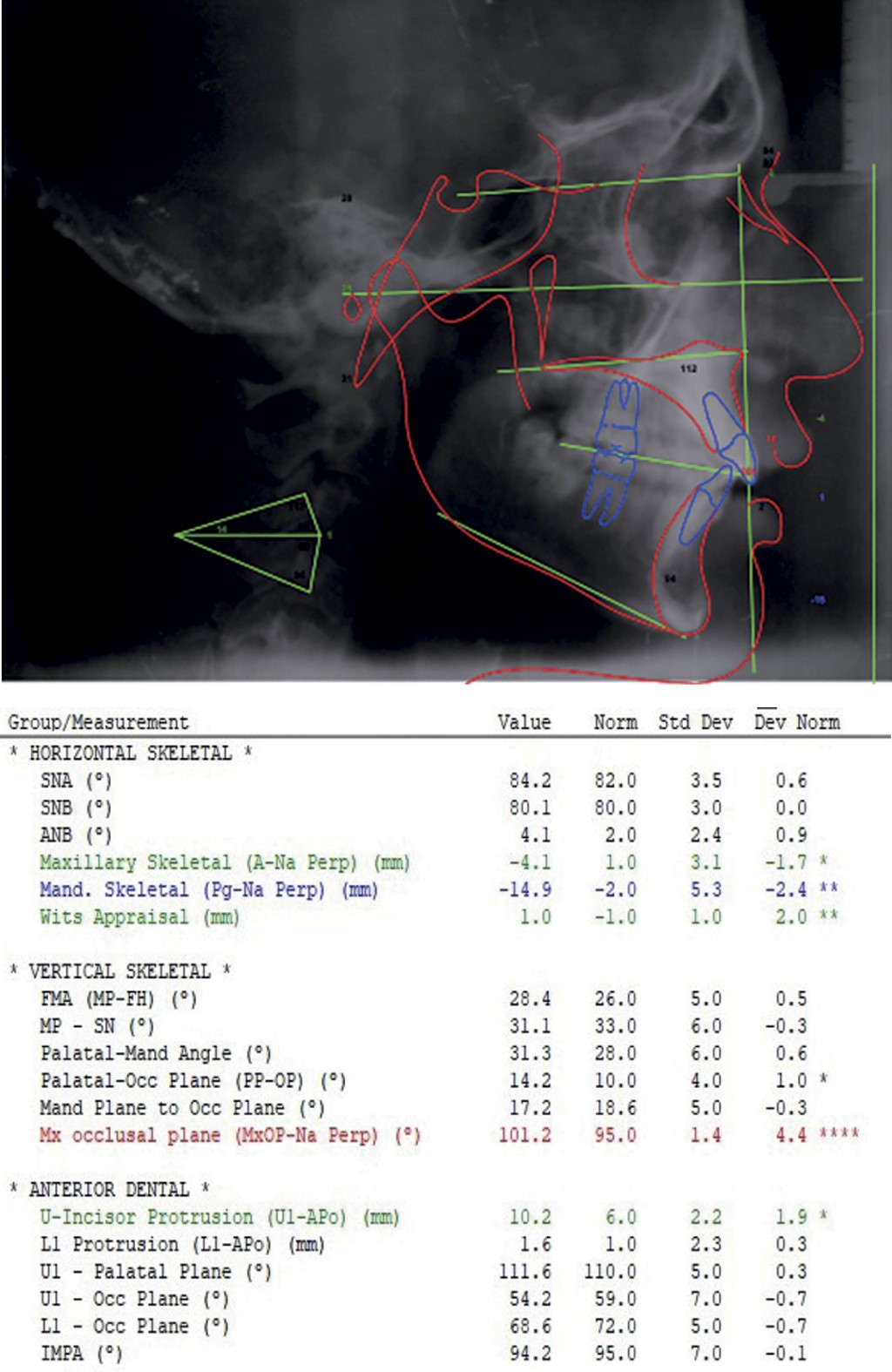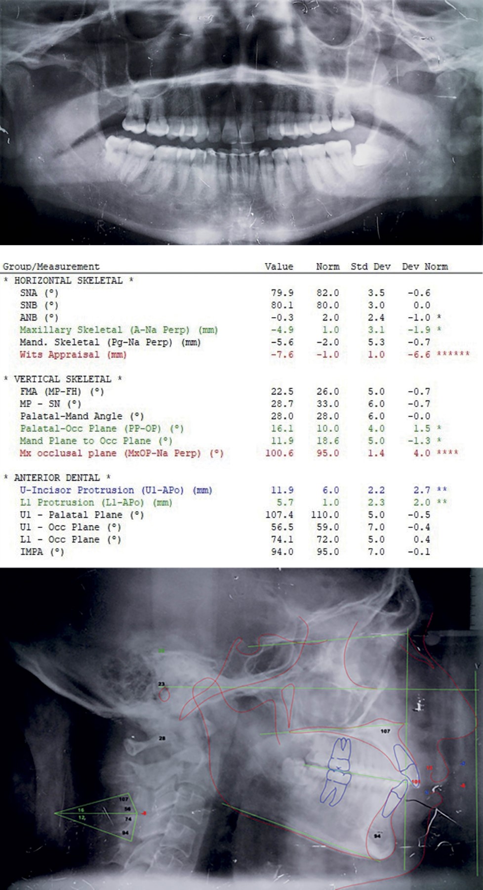 Hombre de 25 años con una relación de incisivos de clase I sobre una base esquelética I, con un ligero aumento de la altura de la cara inferior y apiñamiento moderado anterior inferior y superior ligero (Figuras 1 y 2). Motivos del tratamiento: no le gusta el apiñamiento anterior inferior y superior; no desea tratarse con aparatos fijos. Historia médica: sin anormalidades médicas relevantes detectables. Higiene bucal: buena. Patrón de tejidos blandos: labios competentes, línea normal del labio inferior y desde la lengua hasta los incisivos superiores presenta un patrón de deglución normal. Sin antecedentes de hábitos pasados. Articulación temporomandibular: no hay evidencia de signos o síntomas de disfunción de la articulación temporomandibular (ATM) ni asimetría facial considerable. Todos los dientes erupcionaron; sin embargo, presenta retención del tercer molar inferior izquierdo. En oclusión: relación de los incisivos de clase I, línea central bien alineada, sobremordida horizontal de 6 mm y vertical de 3 mm. Oclusión posterior: clase I de Angle, segmento labial superior de 7 mm, e inferior de 8 mm de apiñamiento, segmento bucal superior e inferior razonablemente bien alineados, no hay mordidas cruzadas, ni desplazamientos mandibulares. Pronóstico del tratamiento: bueno. Etiología con patrón esquelético clase I y desproporción dentoalveolar (Figura 3).