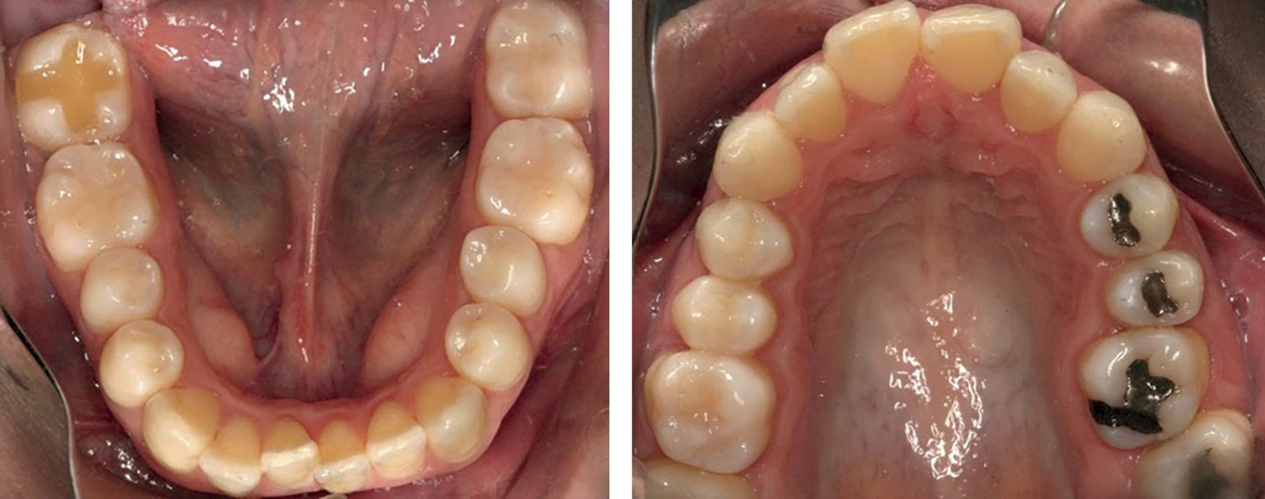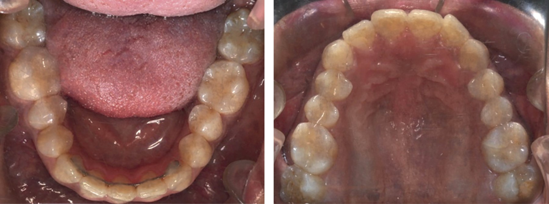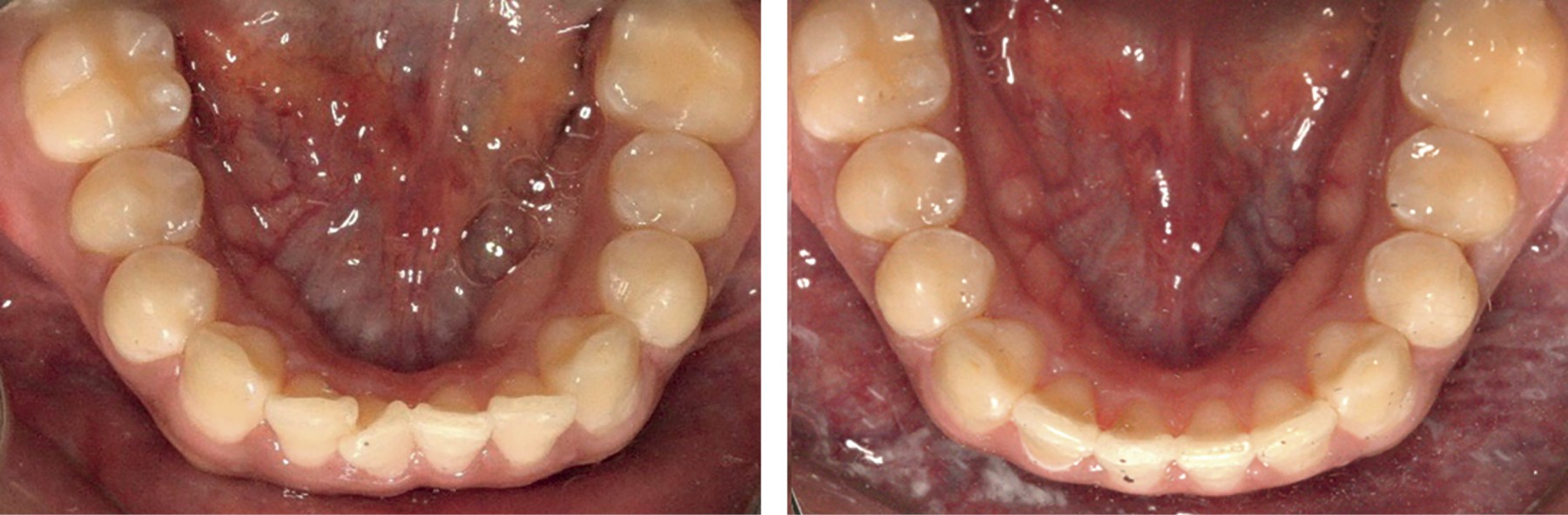 Se le realizó desgaste interproximal en el segmento labial inferior y superior; se mantuvo la distancia intercanina y la de la anchura de la arcada superior e inferior; se mantuvo la posición original del incisivo inferior después del tratamiento de ortodoncia (Figuras 8, 9 y 10).