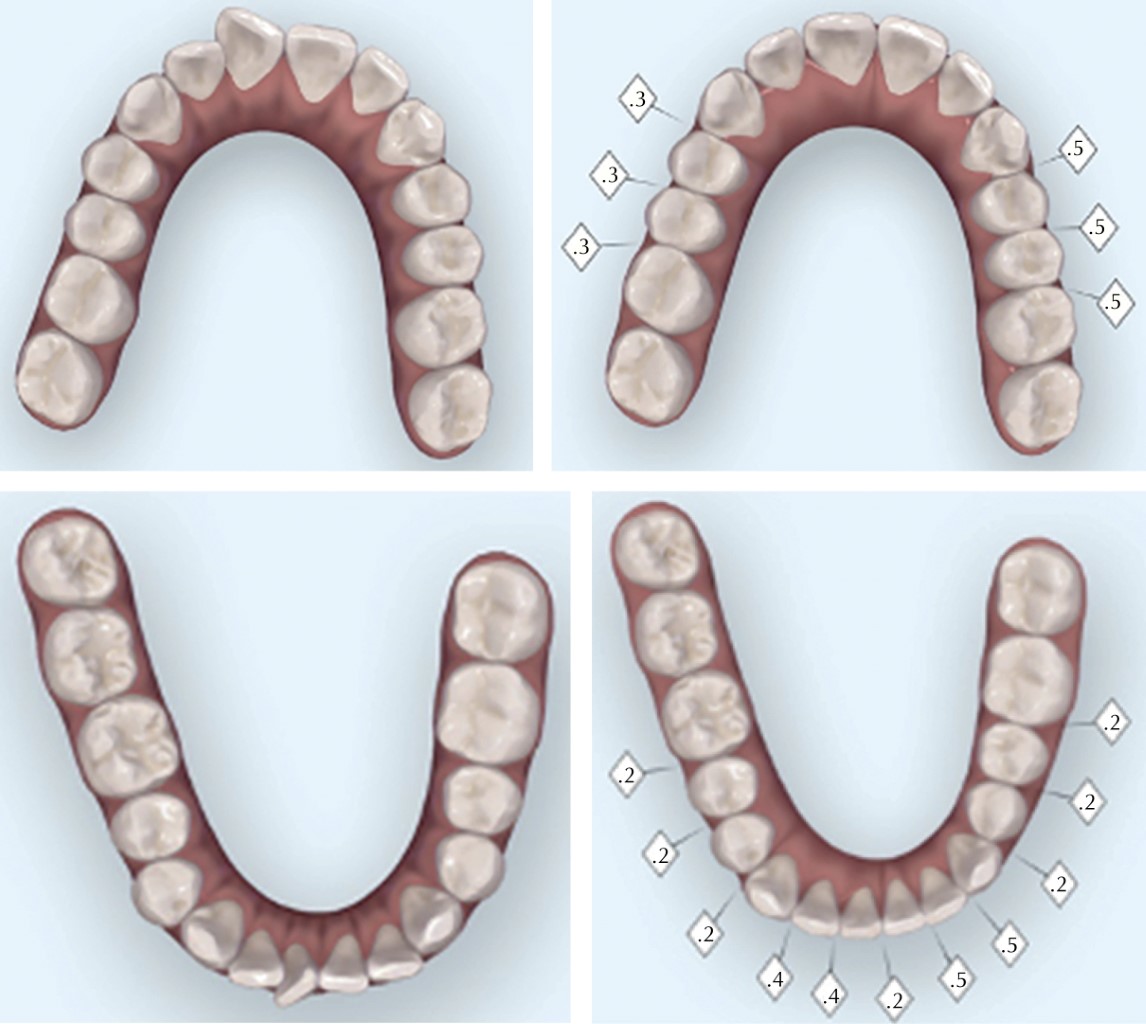 De acuerdo con la guía de tratamiento de Invisalign®,26 el apiñamiento moderado en las maloclusiones clase I, sugiere ser atendido de acuerdo con tres modalidades: