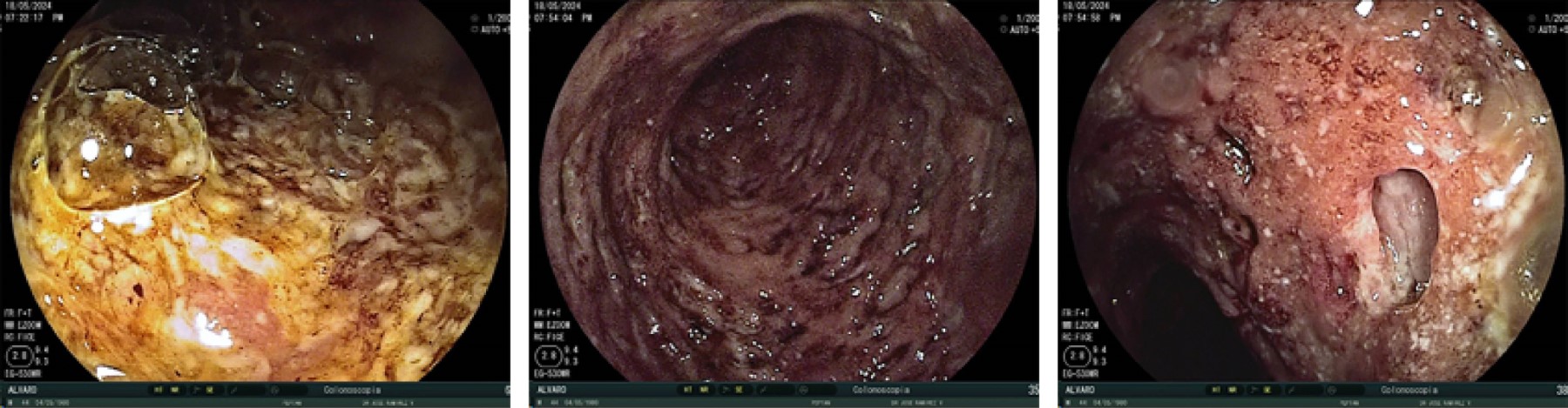 Con dichos hallazgos transoperatorios se solicita colonoscopia (Figura 1) con diagnóstico de probable enfermedad inflamatoria intestinal E2 de Montreal, seis puntos en escala de severidad, (A3 L2 B3p con actividad grave).