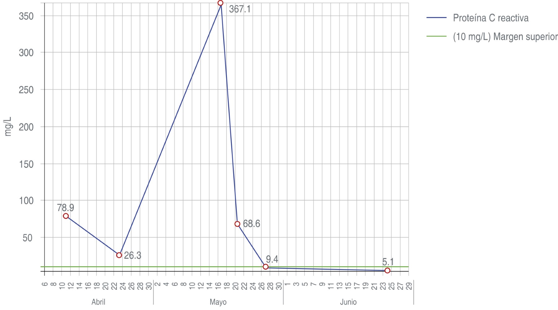 Como parte del seguimiento se observó mejoría en parámetros hematológicos con aumento en hemoglobina y plaquetas, además de reducción en cifras de proteína C reactiva (PCR) (Figura 3). Clínicamente, el paciente mostró disminución en la frecuencia de evacuaciones y mejor tolerancia dietética.