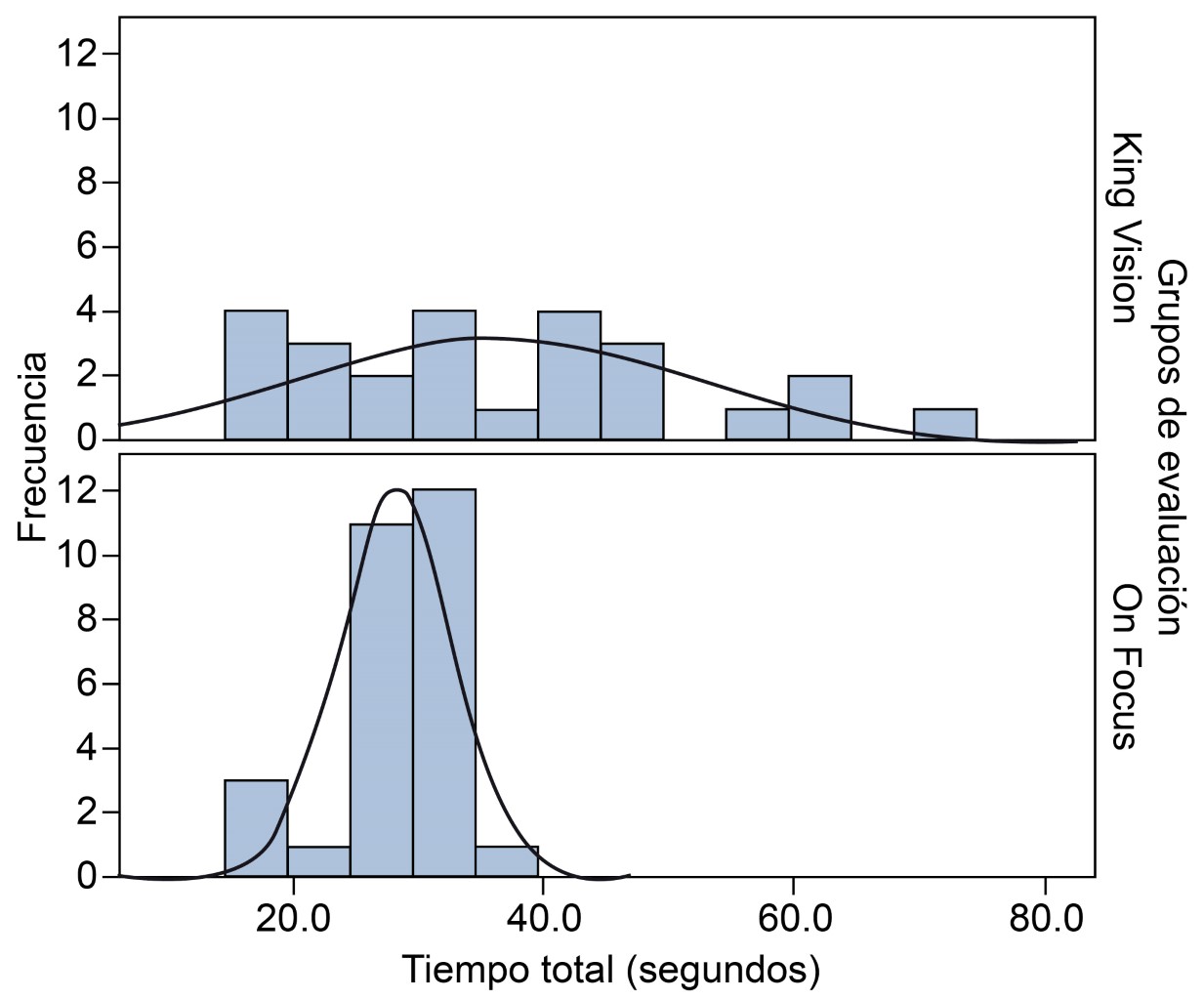 Una vez firmado el consentimiento informado, los pacientes fueron muestreados por el método no probabilístico e intencional y asignados aleatoriamente a los grupos F (On Focus) o K (King Vision). Se comparó el tiempo total de intubación, necesidad de laringoscopias subsecuentes y presencia de lesión en vía aérea.