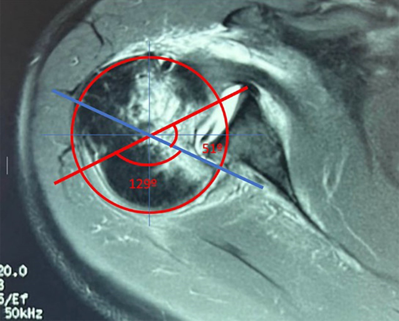 La RM y la TC, además de ayudarnos en el diagnóstico, son de gran utilidad para ayudar al cirujano a analizar la localización y evaluar el porcentaje de pérdida ósea, tanto en la cabeza humeral como en la glena. La RM o la TC son necesarias para evaluar dicho porcentaje, lesiones asociadas y orientar al cirujano hacia la mejor opción de tratamiento.11 Gerber y colaboradores proponen un método para la medición del defecto óseo en RM o TC; en la RM se mide en un corte axial a nivel de la apófisis coracoides o inmediatamente por debajo de la misma, se coloca un círculo sobre la cabeza humeral, se traza una línea desde el centro del círculo hasta el cartílago inmediatamente adyacente a la tuberosidad menor y otra línea desde el centro del círculo hasta el extremo posterior del cartílago adyacente a la inserción del infraespinoso, esta área es el ángulo de superficie articular. Un segundo ángulo, el ángulo del defecto, es el ángulo formado por las líneas que conectan, primero, el límite anterior y, segundo, el límite posterior del defecto con el centro de la cabeza humeral. El porcentaje del ángulo del cartílago representa el 100% de la superficie articular y el ángulo del defecto es el tamaño estimado del defecto de la cabeza humeral.12