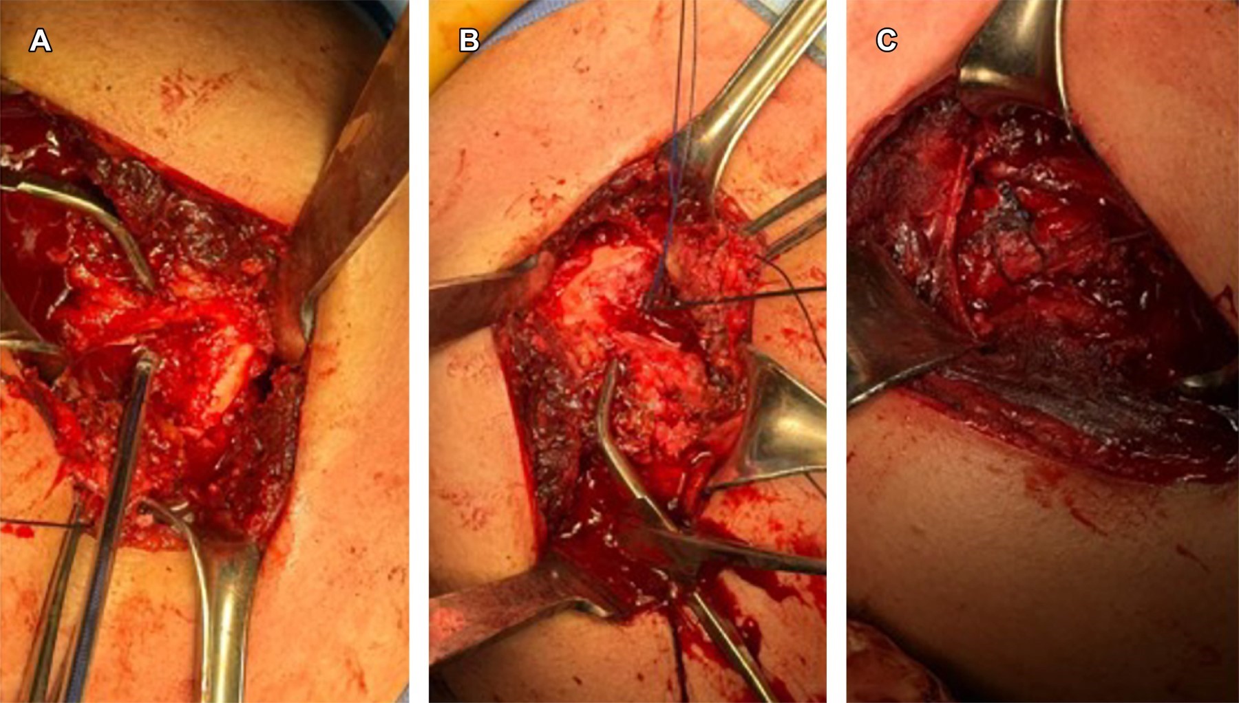 El paciente se posicionó en silla de playa, bajo anestesia general. Se realizó un abordaje deltopectoral, se incidió a través de la cápsula y se redujo la luxación. Se identificó una lesión de McLaughlin de 2 × 3 cm, se limpió el defecto y se colocó un ancla de 3.5 mm con suturas. Se identificó el tendón del subescapular y se realizó la transferencia al defecto con el uso del ancla, siendo reforzado con una sutura transósea de alta resistencia, cubriendo el defecto óseo (Figura 2). Se colocó un inmovilizador universal de hombro.