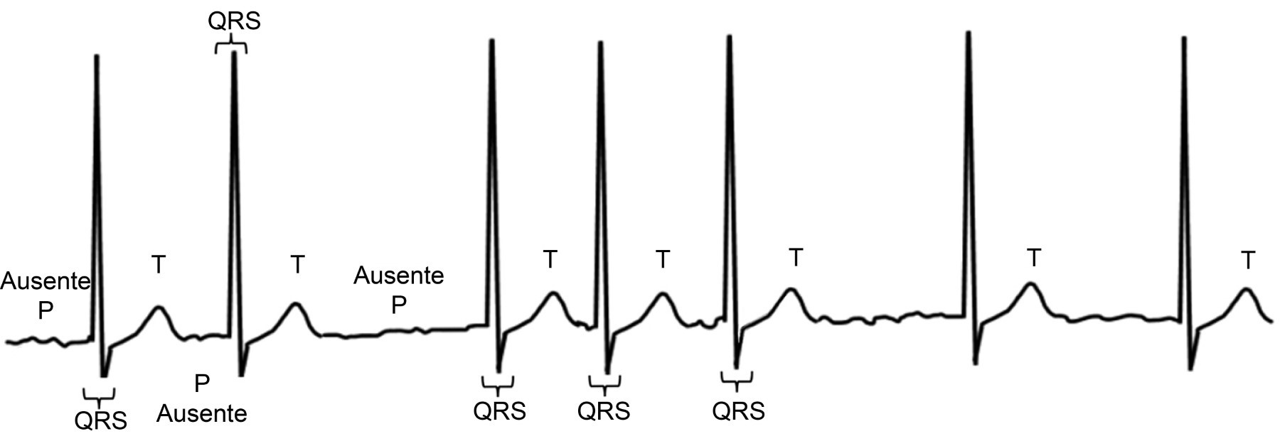 La FA es una taquiarritmia con una frecuencia cardiaca oscilante entre 90 y 170 latidos por minuto, manifestando irregularidades en los complejos QRS con distancias intercomplejo variables y estrechas. En ausencia de ondas P, estas son suplidas por ondas F (Figura 1). En el contexto de la FA, se evidencia la inhibición del nódulo sinusal debido a una despolarización temprana en los miocardiocitos, desencadenando un ciclo repetitivo de activación en cadena que pone en marcha el circuito de microrreentrada. Este último se caracteriza por una frecuencia de despolarización de 400 a 600 por minuto, en contraste con las expectativas fisiológicas de 60 a 100 despolarizaciones por minuto. Las despolarizaciones descoordinadas, asociadas con un voltaje eléctrico reducido, generan microondas P positivas y negativas en el electrocardiograma, con un efecto de temblor disminuido.1,15 La ausencia de ondas P se atribuye a la sincronización desfavorable tras la despolarización auricular. El nódulo AV, actuando como un mecanismo de protección ventricular, filtra parcialmente las contracciones derivadas de potenciales de acción anómalos dando origen a la principal característica de la patología.16