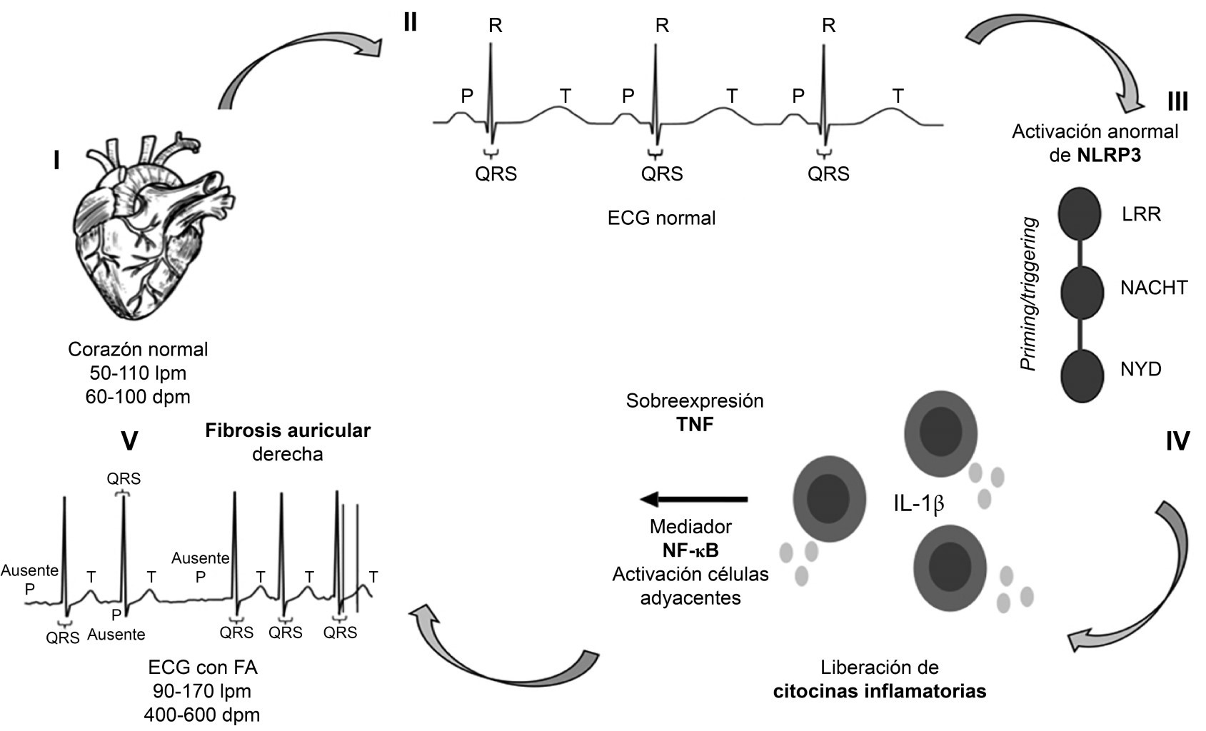 El inflamasoma NLRP3 es un complejo proteico intracelular que se activa en respuesta a señales inflamatorias y desempeña un papel crucial en la génesis de la FA al promover la liberación de citocinas proinflamatorias. El inflamasoma NLRP3 se activa en respuesta a diversos estímulos, incluidos los productos microbianos, los cristales de ácido úrico y los productos derivados del daño celular. Una vez activado, el inflamasoma NLRP3 desencadena la activación de la caspasa-1, que a su vez promueve la maduración y liberación de citocinas proinflamatorias como la interleucina-1 beta (IL-1β) y la interleucina-18 (IL-18), estas citocinas promueven la inflamación y la remodelación estructural del corazón (Figura 2). La activación del inflamasoma NLRP3 se produce en dos etapas: la "priming", que aumenta la expresión de componentes del inflamasoma, y la "triggering", que lleva a la formación y activación del inflamasoma en respuesta a estímulos específicos.18