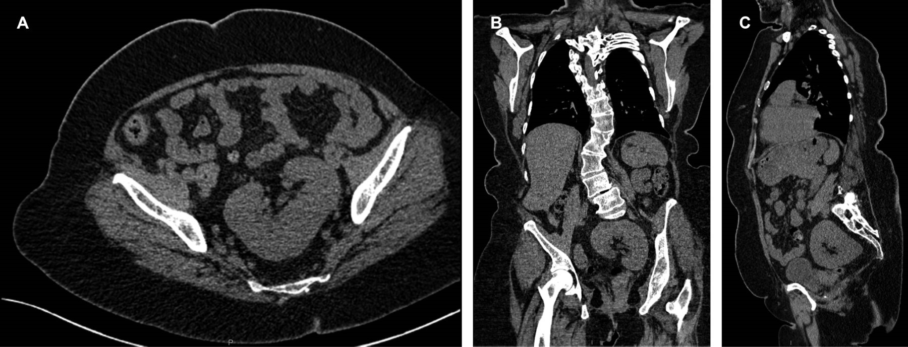 Paciente femenino de 54 años de edad, monorrena con síndrome de Turner y múltiples intervenciones quirúrgicas de columna dorsolumbar. Actualmente se encuentra en tratamiento con múltiples antiinflamatorios por artrosis de rodillas secundario a escoliosis. Se realizó estudio preoperatorio para evaluación de su columna con tomografía computarizada que en su evaluación abdominopélvica en fase simple y en reconstrucción multiplanar coronal y sagital (Figura 1) se delimitó hallazgo incidental de variante anatómica de tracto urinario del riñón izquierdo, caracterizada como en situación pélvica.