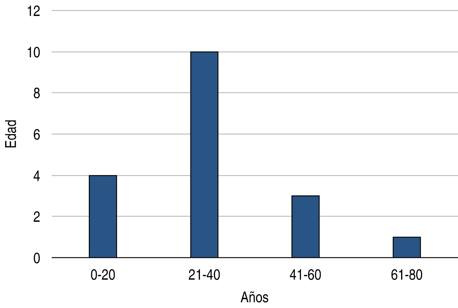 De los datos obtenidos, los grupos etarios fueron los siguientes: 0-20 años con 4 casos, 21-40 años con 10, 41-60 con 3 y 61-80 con 1 (Figura 2).