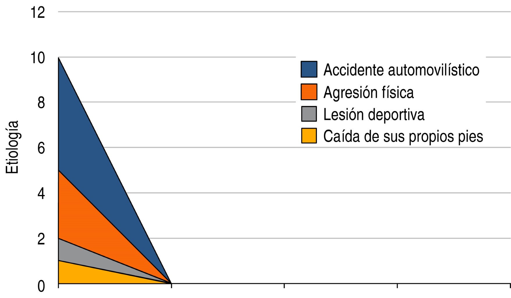 Dentro de los factores etiológicos analizados, los accidentes automovilísticos, principalmente en vehículos motorizados tipo motocicleta, y las agresiones físicas fueron los más comunes en nuestro estudio, lo cual coincide con diferentes estudios revisados.9-11