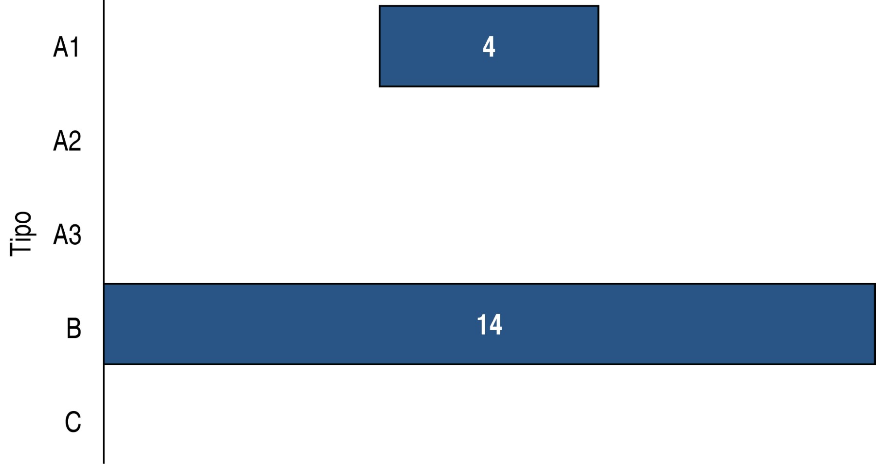 Para la clasificación de las fracturas asociadas a los diferentes traumatismos según los arbotantes involucrados, tuvimos como resultado 14 fracturas tipo B y 4 tipo A1, mientras que para tipo A2, A3 y C el resultado fue 0 fracturas (Figura 4).