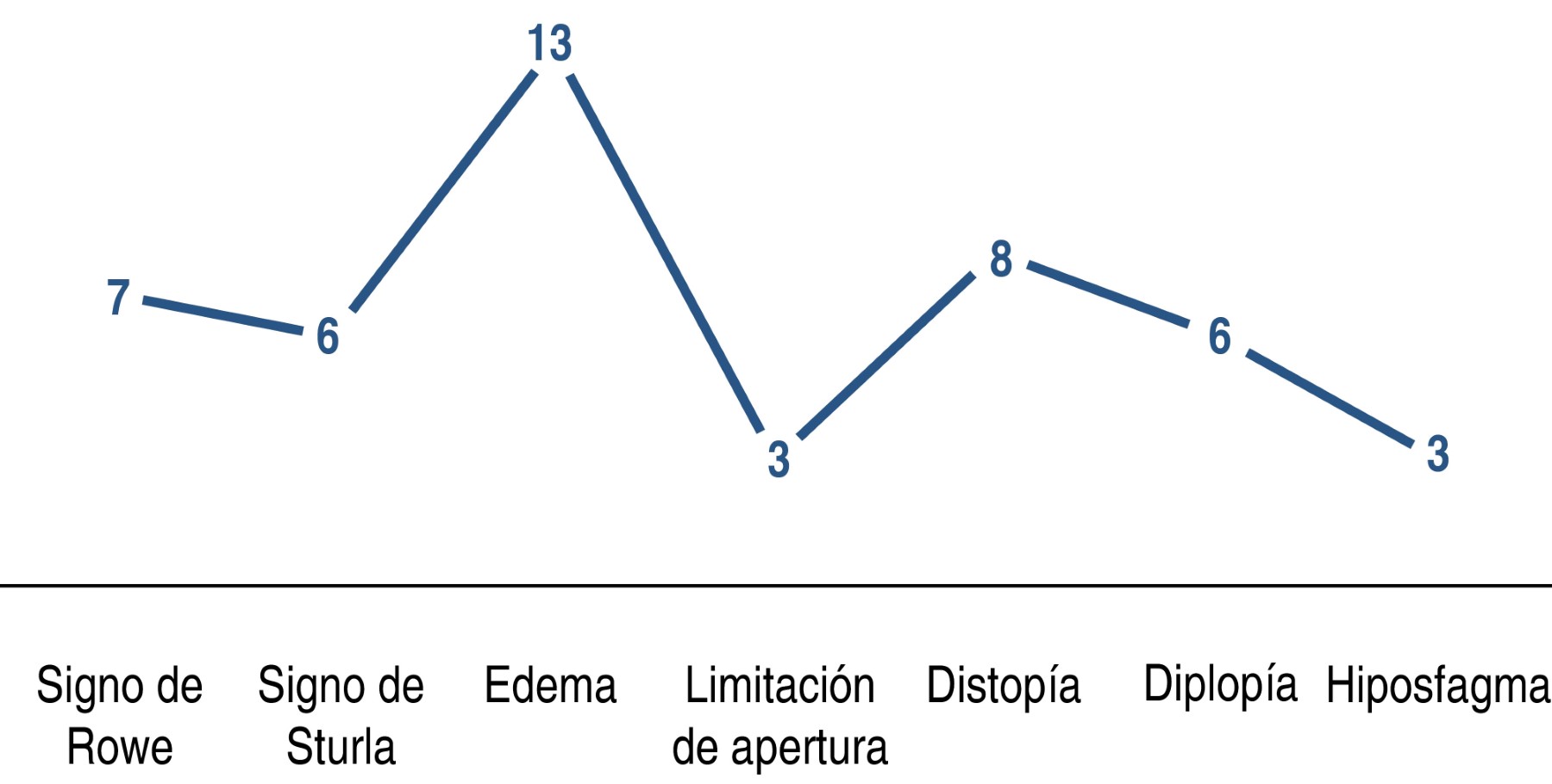 Síntomas: se considera si el paciente en cuestión presentó diplopía, oftalmoplejía, signo de Rowe, signo de Sturla, limitación a la apertura bucal o enoftalmo.
