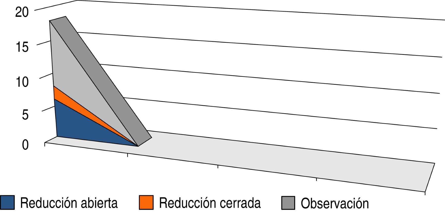 Respecto al tratamiento realizado para cada paciente, los resultados fueron: 6 para reducción abierta, 2 para reducción cerrada y 10 de los pacientes se manejaron con observación (Figura 6).