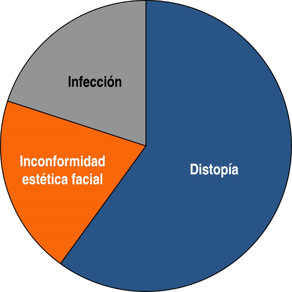 Finalmente, en el apartado de complicaciones, los resultados fueron: distopía (3), inconformidad estética facial (1) e infección de sitio operatorio (1) (Figura 7).