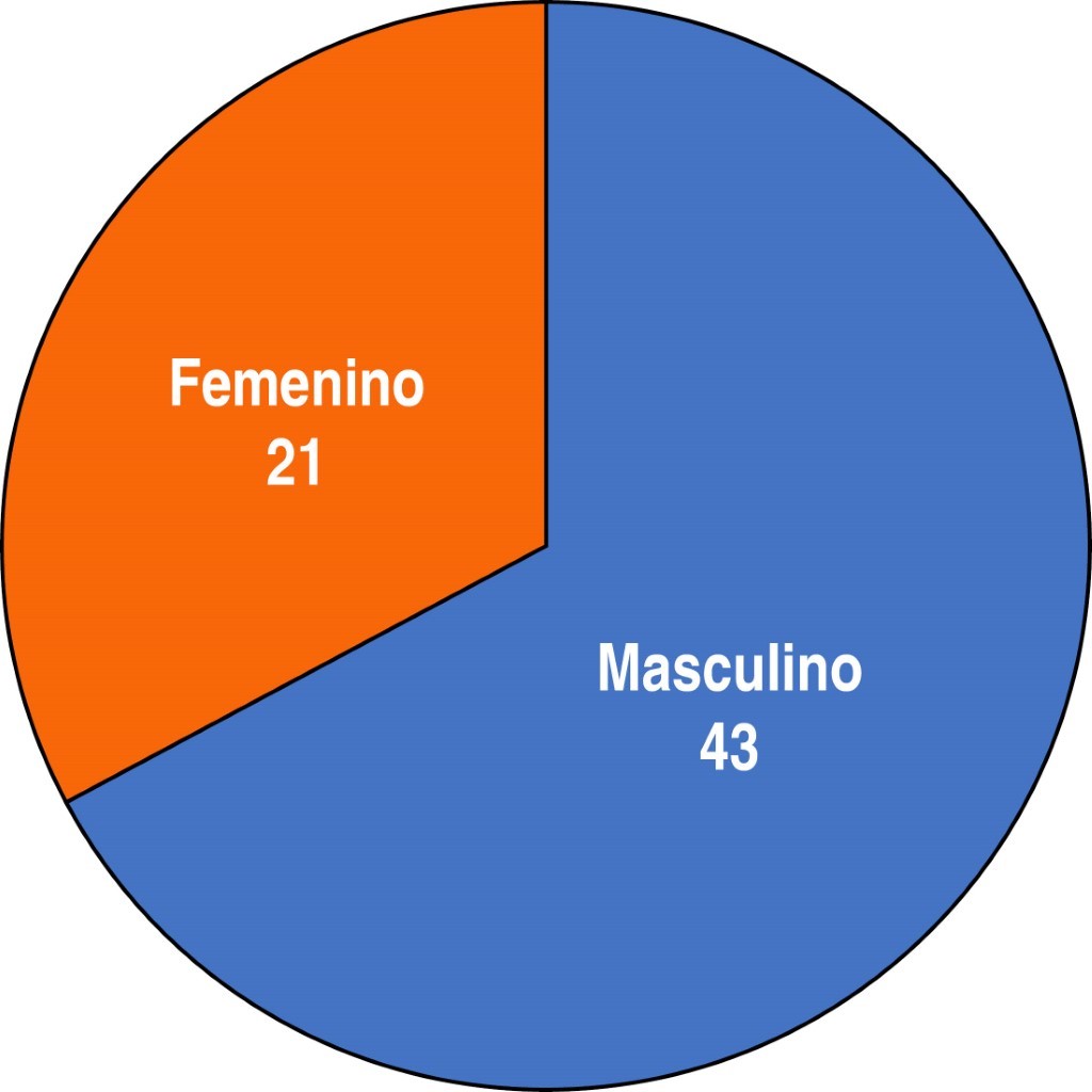 Luego de aplicar los criterios de inclusión y exclusión, se obtuvieron un total de 64 historias clínicas, de las cuales 43 pacientes fueron masculinos y 21 femeninos (Figura 1).