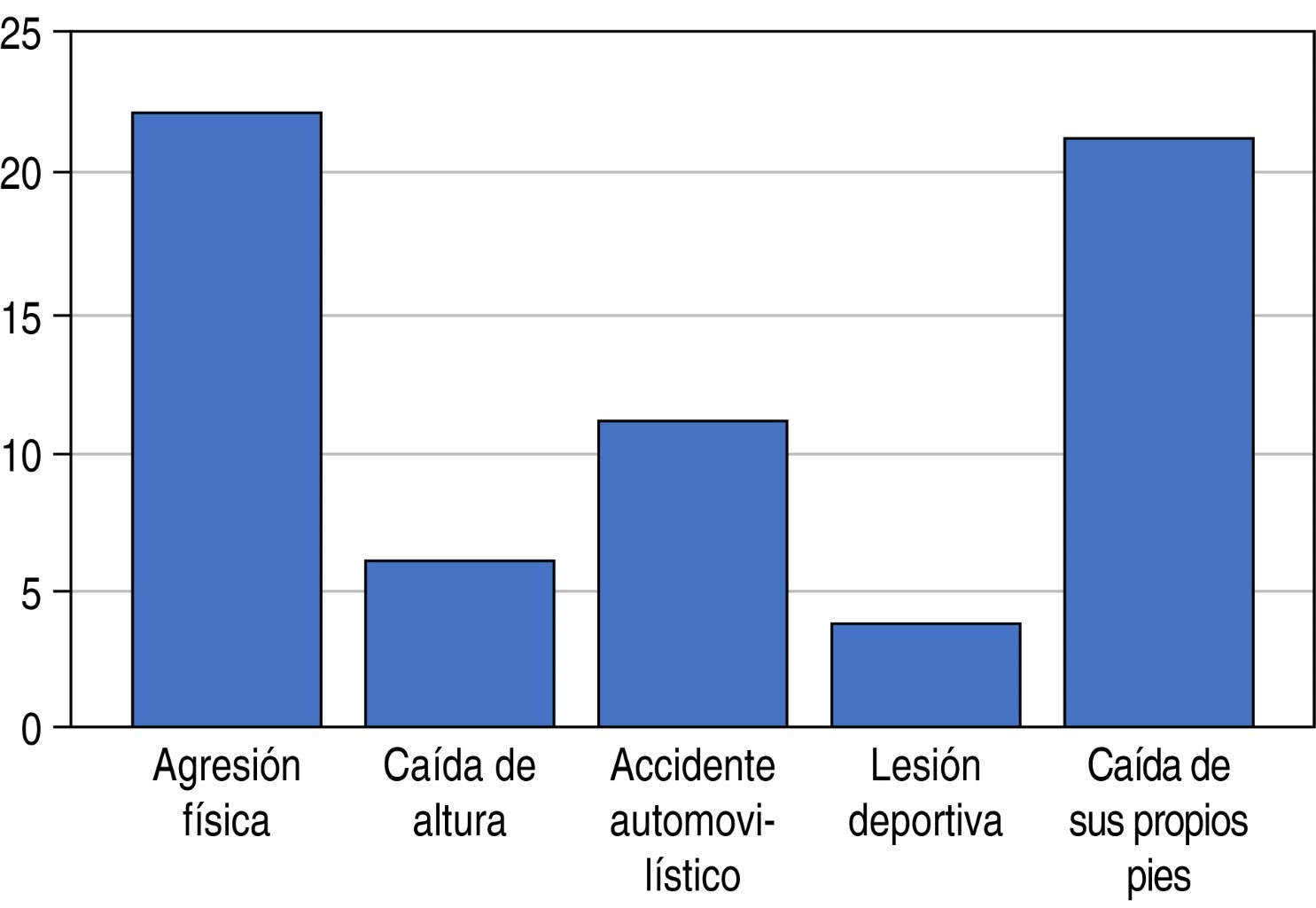 En cuanto a la etiología, se refleja que de los 64 casos, 22 provienen de la agresión física, 21 de caída de sus propios pies, 11 de accidentes automovilísticos, seis por caída de altura y cuatro por lesión deportiva (Figura 3).