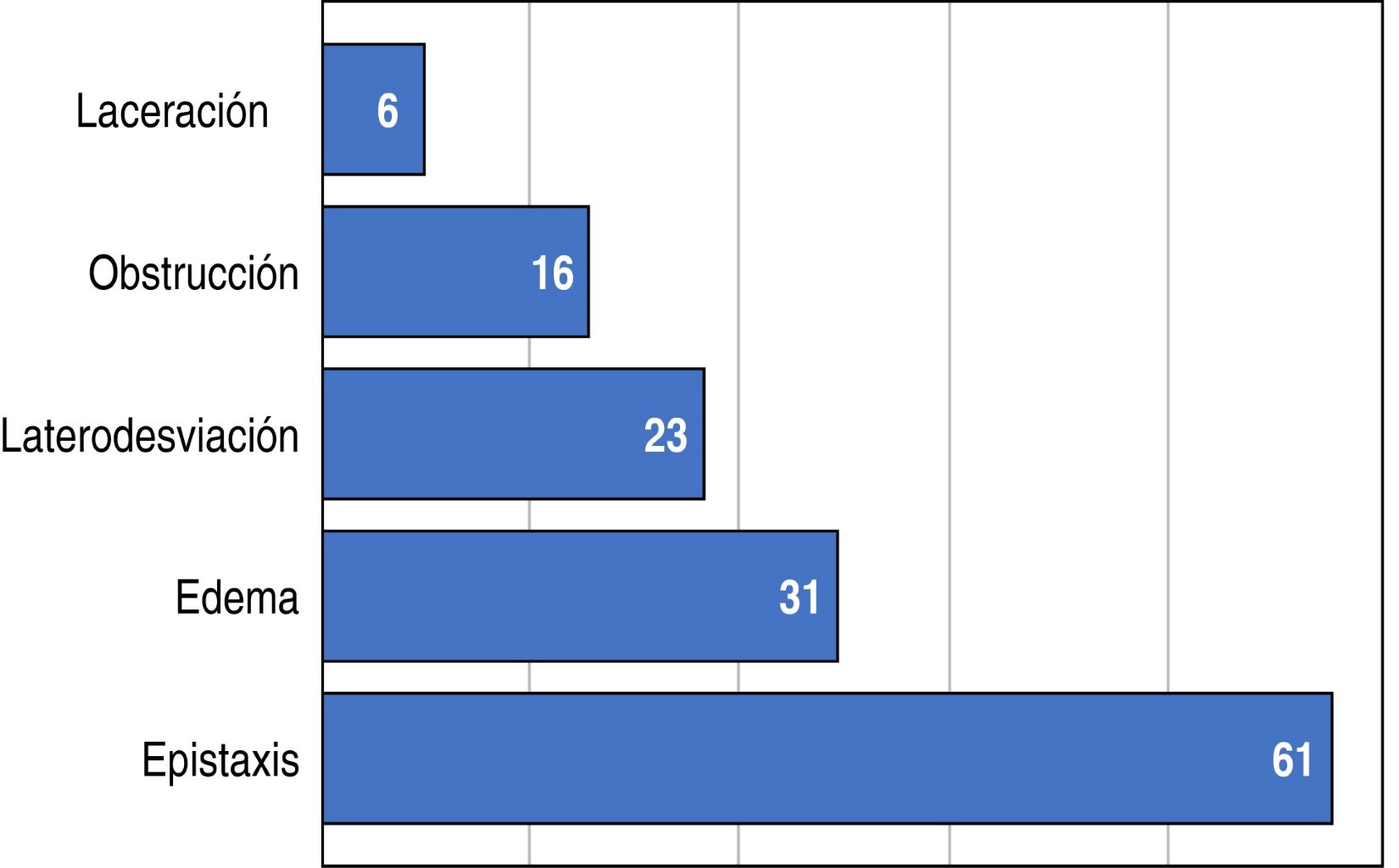 De los signos y síntomas que presentaron los pacientes, el más común fue la epistaxis en 61 casos, asociada a ésta se encuentra el edema que se reflejó en 31 pacientes, posteriormente la laterodesviación se presentó en 23 casos, la obstrucción nasal se reflejó en 16 pacientes y sólo seis presentaron laceraciones (Figura 4).