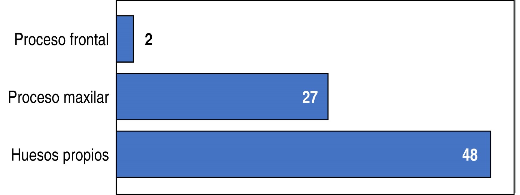 Al momento de evaluar la región anatómica más afectada, se registró que los huesos propios nasales se encontraron afectados en 48 casos, el proceso frontal del hueso maxilar se vio afectado en 27 casos y el proceso nasal del hueso frontal en sólo dos sujetos (Figura 5).