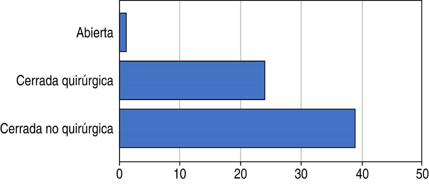 Al revisar el tratamiento realizado en cada uno, se refleja que la reducción cerrada no quirúrgica fue realizada en 39 pacientes, mientras que la reducción cerrada quirúrgica fue realizada en 24 pacientes y sólo uno fue tratado con reducción abierta (Figura 6).