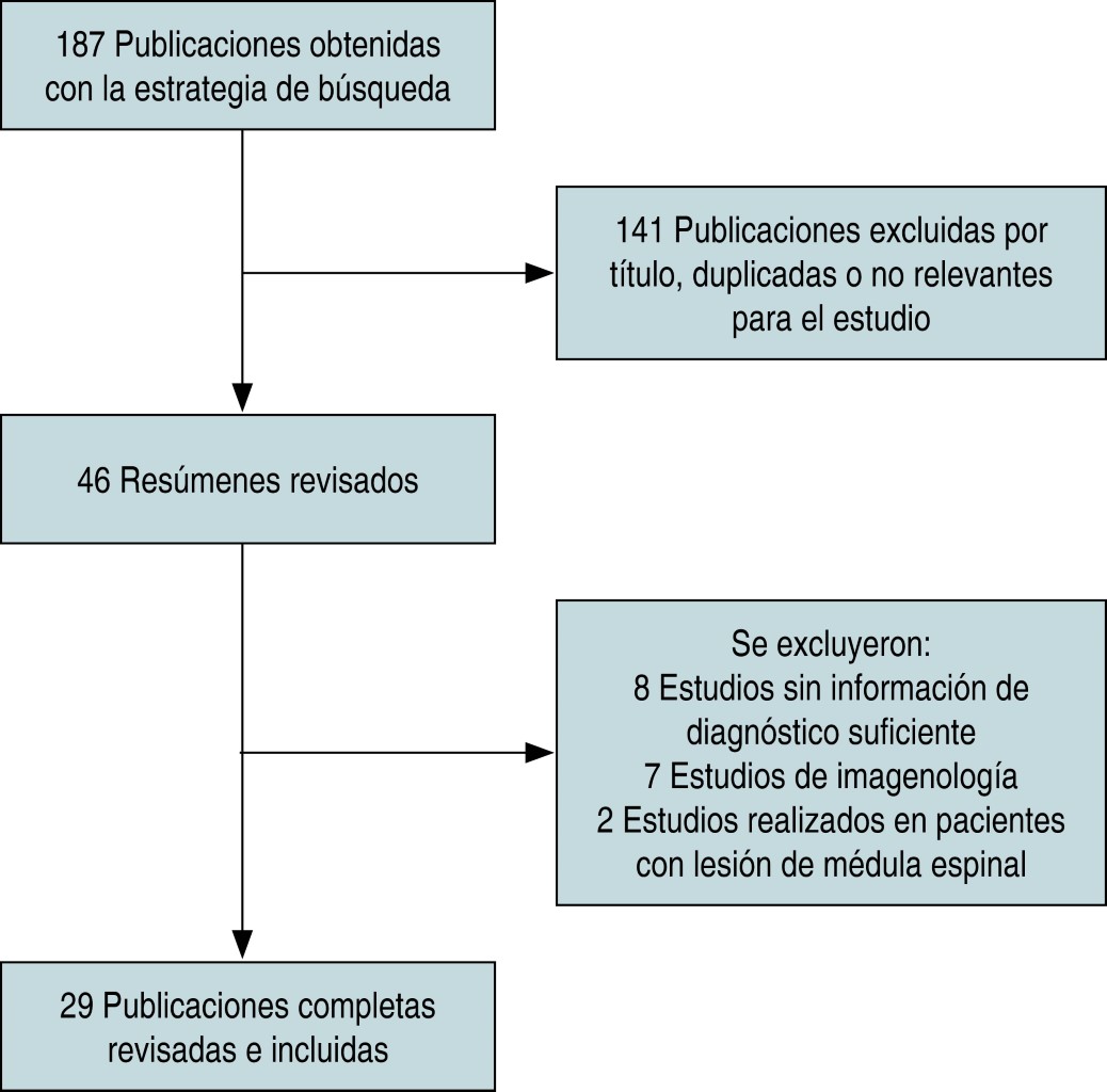 El proceso de selección de estudios se encuentra resumido en la Figura 1. Con la aplicación de la estrategia de búsqueda, se encontraron un total de 187 artículos. Se excluyeron por título: artículos duplicados, estudios que no se consideraron relevantes para el objetivo de este estudio y aquellos que cumplían con algún criterio de exclusión. Se excluyeron un total de 141 artículos. Se revisaron por pares 46 resúmenes y fueron excluidos 17 estudios de la siguiente manera: 8 estudios que no presentaban información de diagnóstico suficiente, 7 estudios de imagenología y 2 estudios realizados en pacientes con lesión de la médula espinal. Se incluyeron un total de 29 publicaciones.