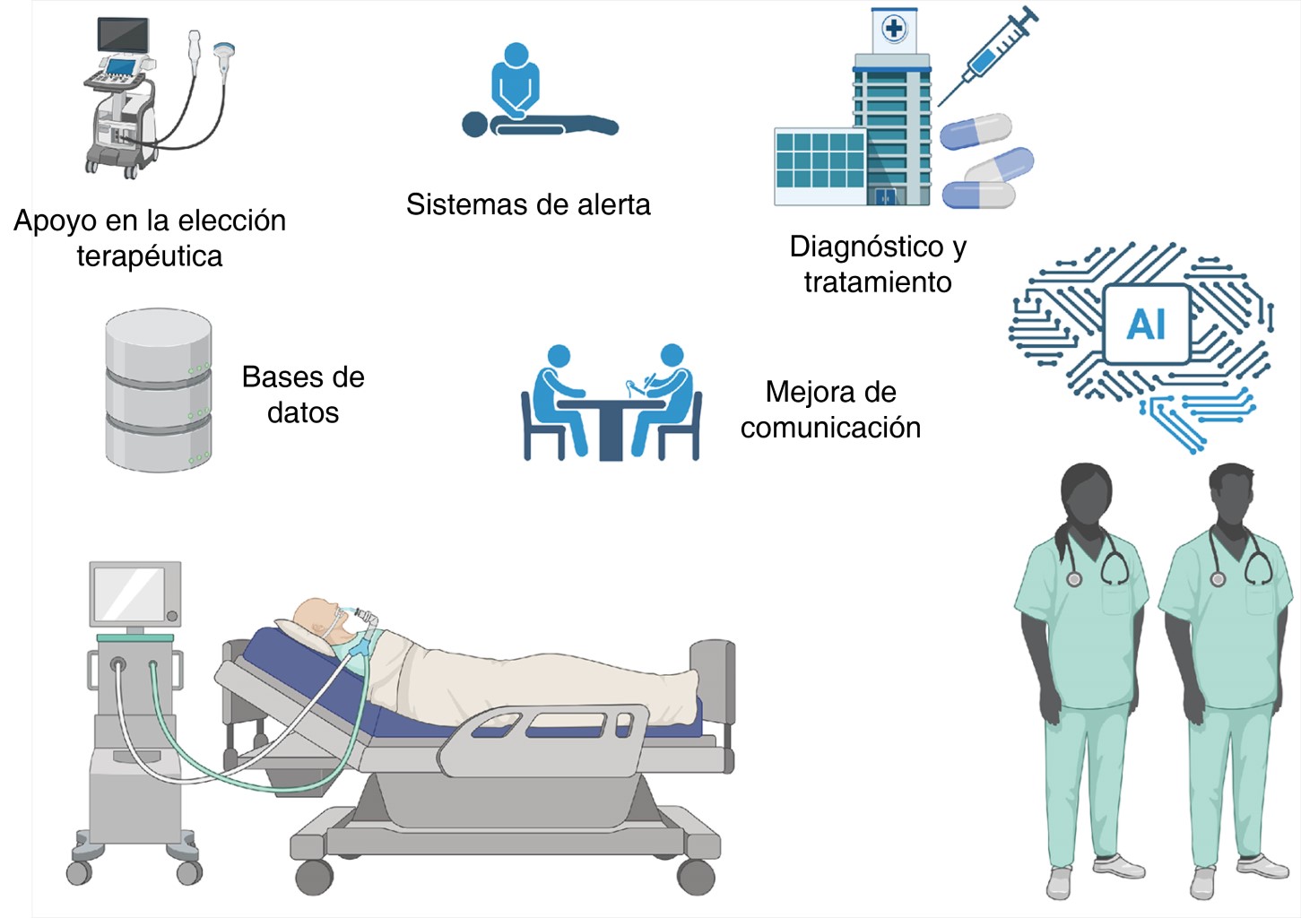 La integración de la IA en la medicina crítica ha generado un cambio profundo en la forma de analizar datos, optimizar la toma de decisiones y mejorar los desenlaces clínicos. Su aplicación en unidades de cuidados intensivos ha demostrado su capacidad para apoyar la predicción temprana del deterioro clínico y de eventos adversos, como la sepsis o la falla orgánica múltiple, lo que permite intervenciones más oportunas y personalizadas.5,6 Además, la IA contribuye a incrementar la eficiencia operativa al automatizar tareas repetitivas, optimizar los flujos de trabajo y priorizar los recursos de manera más eficaz en contextos de alta demanda asistencial.7,8 De igual forma, fortalece la seguridad del paciente mediante sistemas de alerta temprana, monitorización continua y análisis predictivos que facilitan la detección de complicaciones potenciales.9,10 Por otra parte, la IA ofrece oportunidades valiosas para la educación continua al proporcionar retroalimentación objetiva y soporte clínico dinámico.11 Sin embargo, también plantea retos éticos, legales y de equidad en el acceso que requieren marcos regulatorios y estrategias de implementación responsables.12,13