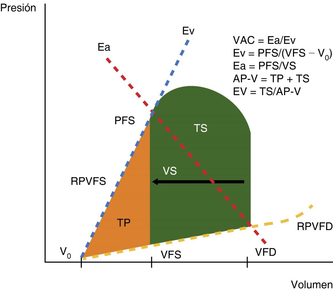 Nuestro concepto principal de esta revisión es el acoplamiento ventrículo-arterial (AVA) el cual nace del análisis de la interacción del ventrículo y el sistema arterial. Este análisis se basa en la interacción mecánica de ambos sistemas y así como se ha mencionado poder predecir el VS. Esto se puede observar en el diagrama de asa presión-volumen del ventrículo izquierdo, recordemos que es donde ambos sistemas interaccionan a partir de su relación de presión-volumen al final de sístole. La elastancia ventricular (Ev) representa la relación de la presión al final de sístole (PFS) y el volumen al final de sístole (VFS); siendo el VFS igual a la presión sistólica (PS) × 0.9 (Figura 3). Entonces el AVA se definiría como la relación entre la Ev y la Ea; teniendo a la Ea como una medida de la CA del ventrículo, y la Ev como una medida del rendimiento ventricular, esto representaría en conjunto el rendimiento cardiovascular de ambos sistemas, el corazón y el sistema arterial.10