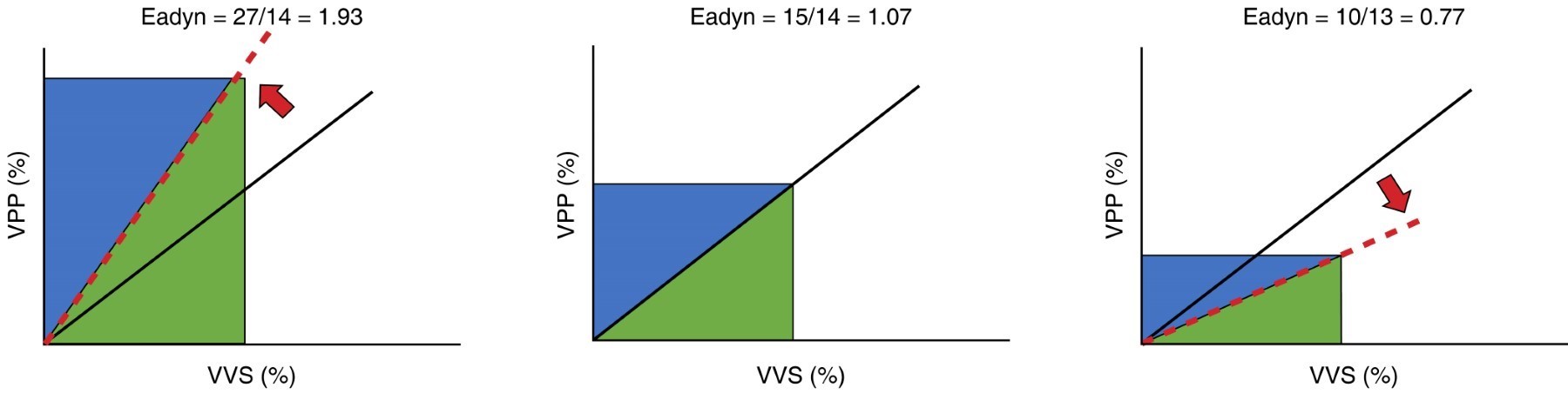 3) Eadyn = Variación de volumen sistólico (VVS)/Variación de presión de pulso (VPP)