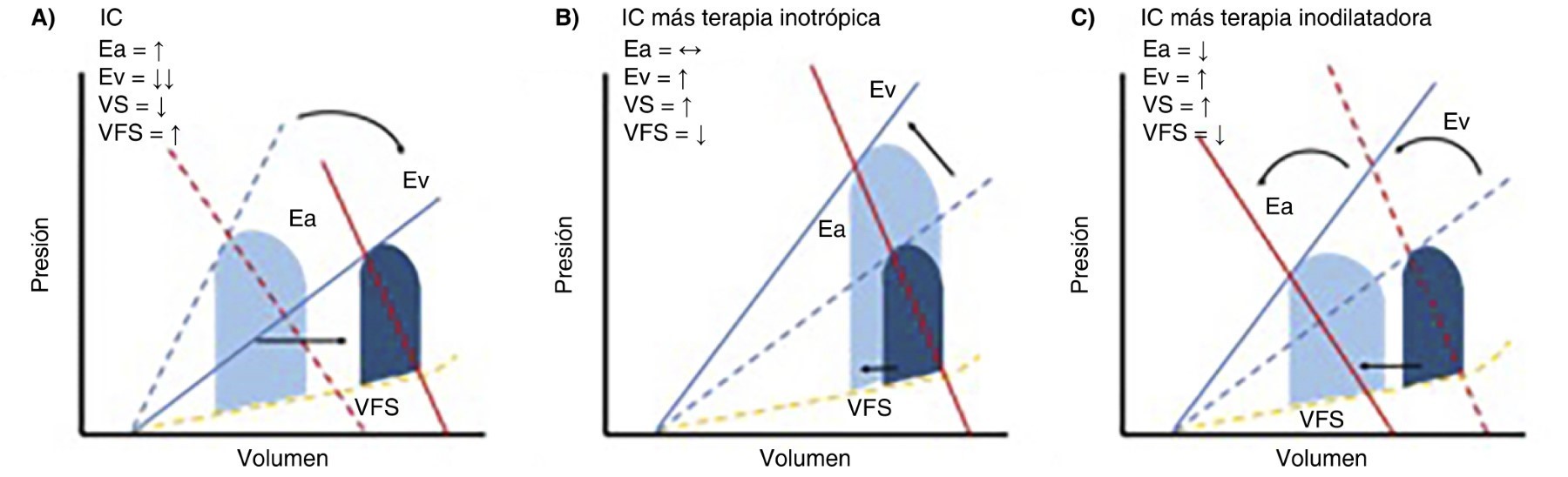 Durante la insuficiencia cardiaca disminuye la función contráctil del ventrículo izquierdo, con disminución de la perfusión sistémica, desplazando RPVFS hacia abajo y a la derecha, descendiendo la Ev; además, el sistema renina-angiotensina-aldosterona y el sistema nervioso simpático se sobreactivan, en búsqueda de aumentar el volumen intravascular y la CA como medida compensatoria de la disminución del VS del ventrículo izquierdo, esto da como resultado el incremento de la Ea. La relación Ea/Ev puede aumentar una a cuatro veces su valor normal.