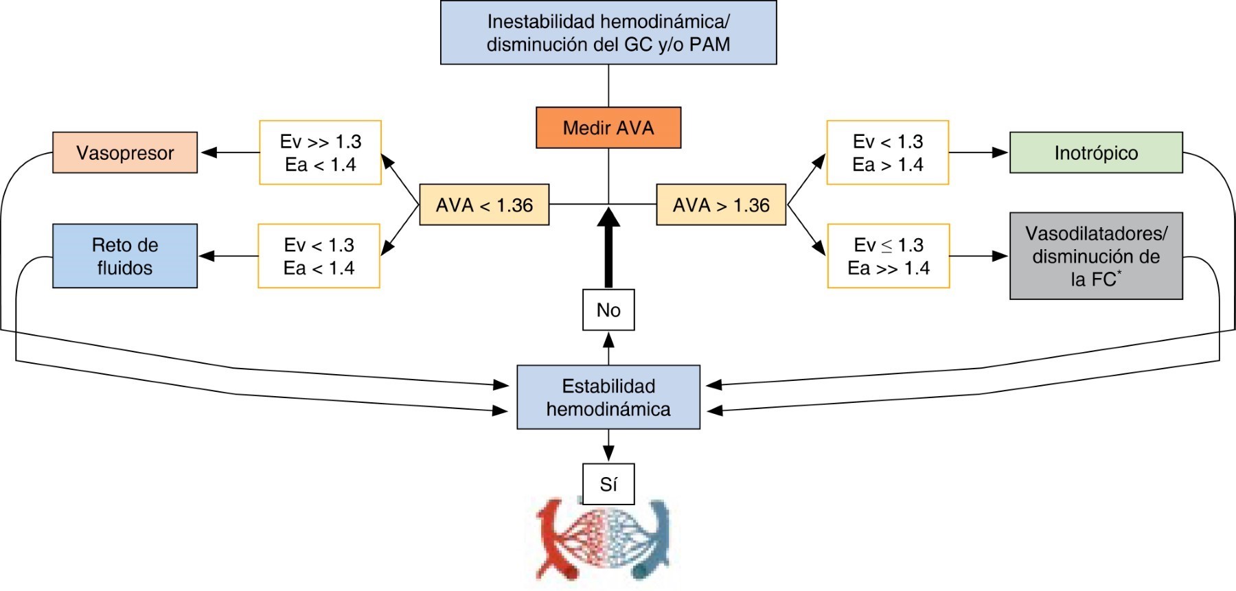 En cuanto al rendimiento cardiaco, proporciona una visión clara de la relación del ventrículo con las demandas impuestas por el sistema arterial. Facilita la personalización de los tratamientos al identificar más claramente las causas de la hipotensión o la inestabilidad hemodinámica. Podemos plantear un algoritmo basado en los valores absoluto de AVA y de sus determinantes para escoger la terapéutica a utilizar (Figura 7).