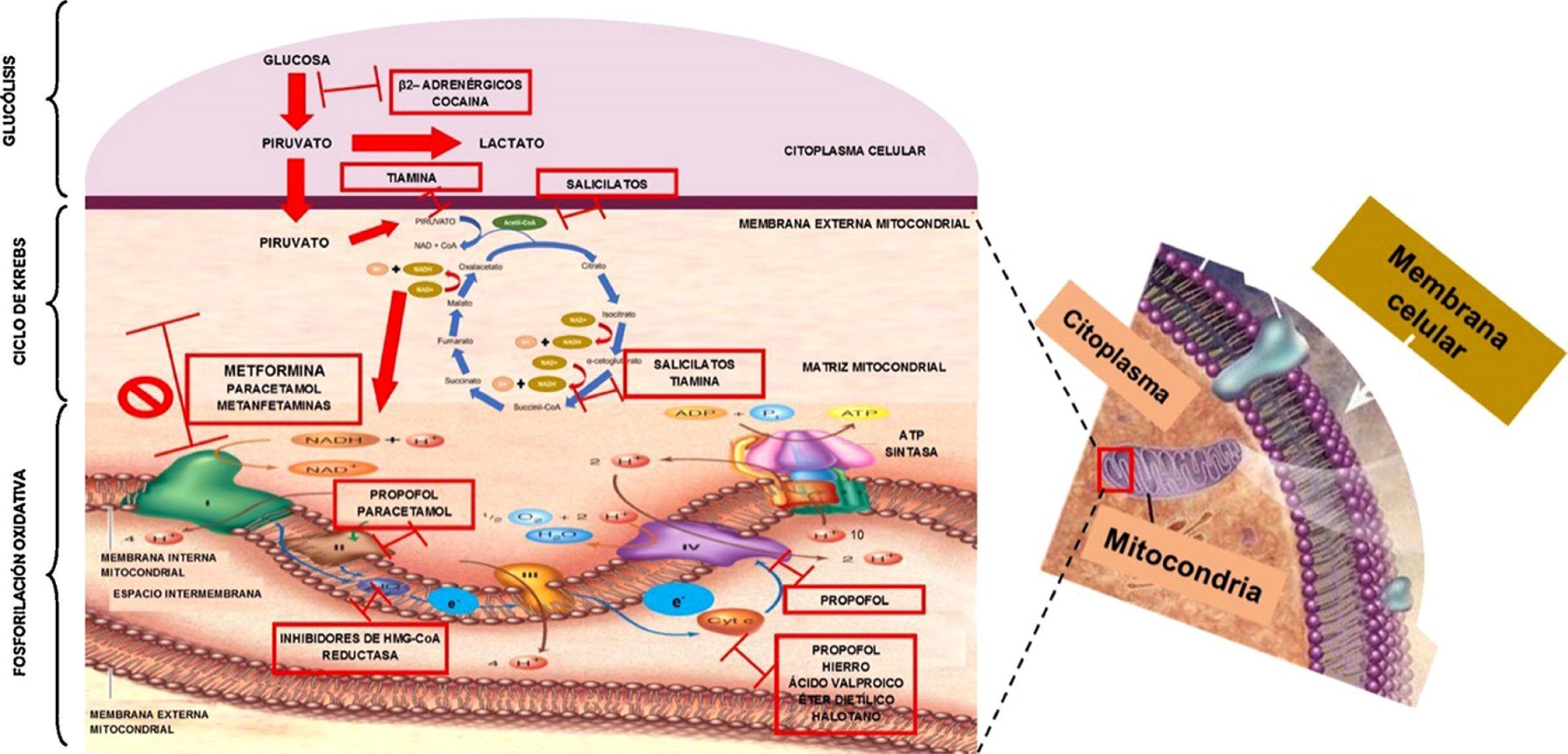 El mecanismo fisiopatológico está estrechamente relacionado al metabolismo celular de los nutrientes, algunos procesos ocurren en el citoplasma y otros a nivel mitocondrial. Todos los procesos oxidativos tienen lugar en las mitocondrias en presencia de oxígeno.6 En condiciones anaeróbicas, los nutrientes pueden metabolizarse rápidamente en el citosol. Sin embargo, la mayor parte de la energía se obtiene a nivel mitocondrial a través de los complejos de la cadena respiratoria de electrones. Las reacciones más importantes que dan lugar a esta gran cantidad de energía pertenecen al ciclo de Krebs. El principal combustible del ciclo de Krebs es el piruvato, derivado del lactato producido por la glucólisis anaeróbica citosólica. El piruvato representa el primer producto que entra en la mitocondria. En el citosol, el aumento del metabolismo anaeróbico se asocia a una mayor producción de lactato, que debe convertir en piruvato para obtener energía dentro de la mitocondria. La inhibición de la conversión de lactato en piruvato podría representar un factor limitante para la producción de energía y un riesgo para la acumulación celular de lactato. Paralelamente, la inhibición del piruvato en mitocondrias podría provocar un aumento de la conversión de piruvato en lactato y un mayor riesgo de acumulación de lactato citosólico. La acumulación intracelular de lactato conduce a la reducción del pH y a la acidosis láctica7 (Figura 1).8