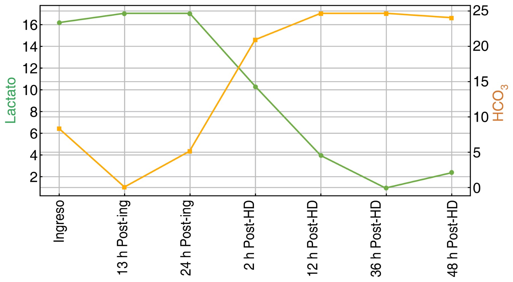 En urgencias, se recibe neurológicamente con somnolencia; deshidratada, con taquicardia; mediante gasometría se detecta una acidosis metabólica grave no compensada con anión GAP elevado debido a hiperlactatemia (Tabla 2, Figuras 2 y 3) por lo que se administra solución glucosada y se ingresa a piso de medicina interna. Se administra terapia hídrica, bicarbonato intravenoso y se realizan ocho recambios de diálisis peritoneal en agudo, siendo la acidosis metabólica refractaria al tratamiento, por lo que se decide terapia de reemplazo renal con hemodiálisis, con una duración de dos horas y ultrafiltrado de 1,500 mL. Posterior a la misma, la paciente presenta mejoría clínica y paraclínica con disminución de azoados, disminución de los niveles de potasio, reversión de acidosis y depuración de lactato mayor de 50% en 12 horas y 90% a las 24 horas (Tabla 3 y Figura 4).