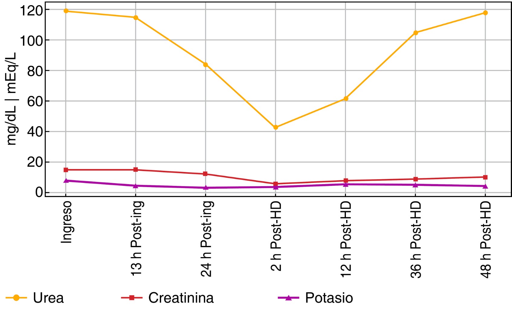 Después de sesión de hemodiálisis, ingresa a Unidad de Cuidados Intensivos para continuar con estrecha vigilancia, donde permanece 48 horas sin presentar complicaciones y sin criterios para otra sesión de hemodiálisis; solamente presenta descontrol hipertensivo, realizándose ajuste de antihipertensivos orales. Debido a buena evolución, se decide su egreso, indicando continuar con diálisis peritoneal automatizada (DPA).