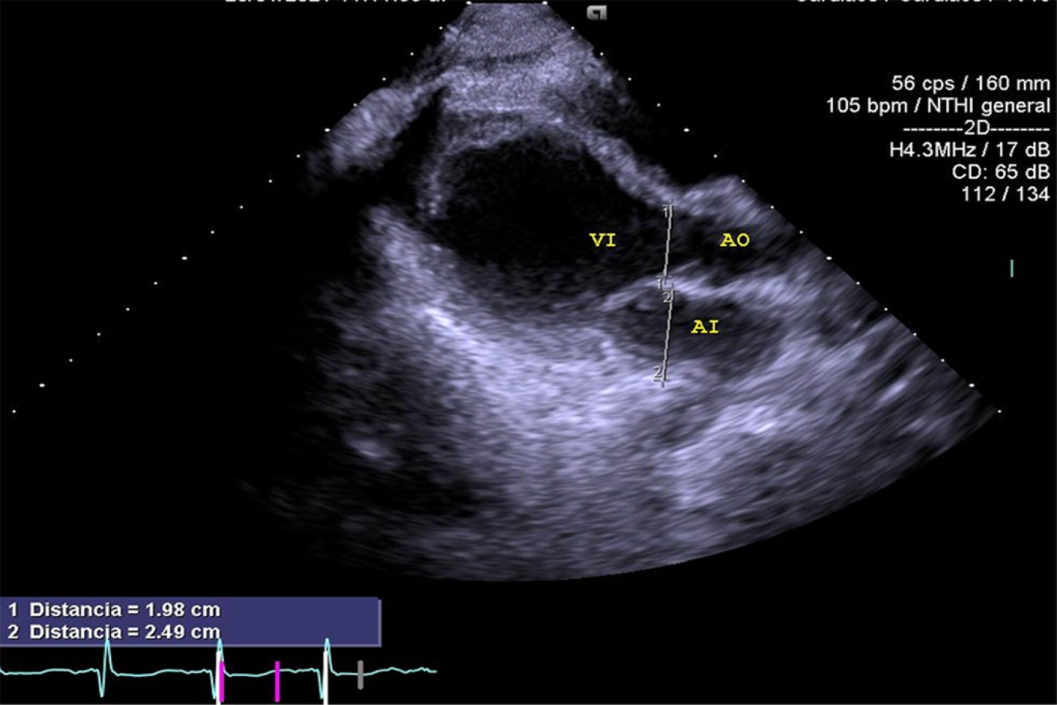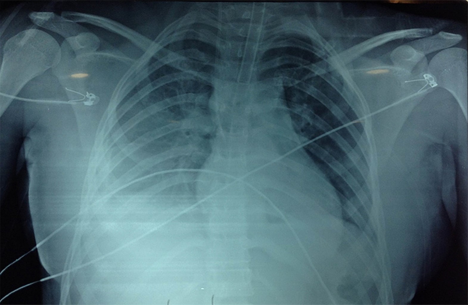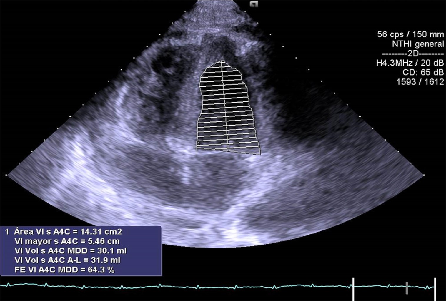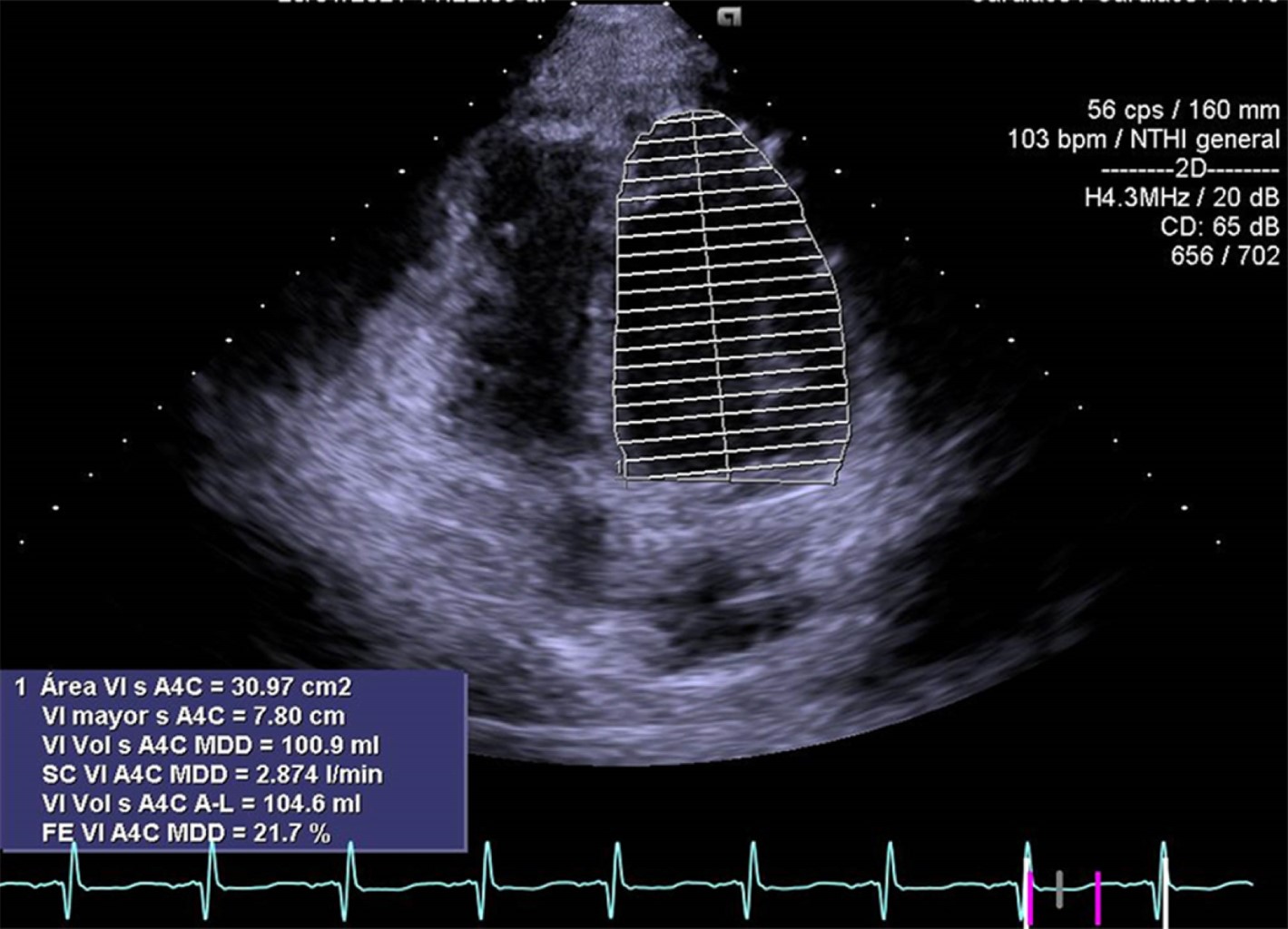 Mujer de 17 años de edad sin antecedentes de importancia, la cual ingresa al área de urgencias trasladada por paramédicos en camilla después de sufrir trauma debido a desaceleración súbita por caída de 10 metros de altura, sufriendo contusión directa y múltiples fracturas en miembros pélvicos, pelvis y cara, por lo que se le realizó colocación de fijadores externos en pelvis y lavado quirúrgico. Ingresó a terapia intensiva con Glasgow de 15 puntos, facies álgica, palidez de piel y tegumentos, con dolor intenso en pelvis escala visual analógica (EVA) 9/10. Con requerimiento de oxígeno suplementario a cinco litros por minuto con disminución de los movimientos de amplexión y amplexación del hemitórax derecho, matidez a la percusión, aumento de las vibraciones vocales y disminución de murmullo vesicular en región basal de hemitórax derecho; signos vitales: presión arterial (TA) 90/50 mmHg, frecuencia cardiaca (FC) 109 latidos por minuto (lpm), frecuencia respiratoria (FR) 16 respiraciones por minuto (rpm), saturación periférica de oxígeno (SpO2) 100%, temperatura 36.6°C, llenado capilar 4 s. Laboratorio: hemoglobina (Hb) 6.8 g/dL, hematocrito (Hct) 19.9%, plaquetas 88,000 × 109/L, tiempo de protrombina (TP) 17.3 s, tiempo parcial de tromboplastina (TPT) 27.5 s, índice internacional normalizado (INR) 1.29, creatina fosfocinasa (CPK) 1,282.52 U/L, isoenzima MB de la creatina cinasa (CPK-MB) 1.2 ng/dL. Se realiza tomografía de abdomen, la cual evidencia hematoma retroperitoneal evolutivo desde plano fascial y perirrenal posterior. La paciente ameritó ventilación mecánica y fue sometida a laparotomía exploradora de urgencia. A su egreso de quirófano y posterior a la reanimación con hemoderivados, continuó con datos de choque con TA 60/40 mmHg, frecuencia cardiaca 105 lpm, llenado capilar 5 s, por lo cual requirió manejo con doble vasopresor: norepinefrina 0.15 μg/kg/min y vasopresina 0.03 UI/h; sin embargo, continua con presión arterial media < 65 mmHg. Se le realiza radiografía de tórax (Figura 1) donde se observa contusión pulmonar en región basal de hemitórax derecho, con corazón en gota. Electrocardiograma (ECG) (Figura 2): ritmo sinusal, frecuencia cardiaca 120 lpm, con aplanamiento de la onda T en la mayoría de las derivaciones excepto en V2, depresión del segmento ST en aVR y ausencia de elevación del segmento ST en V1. Se realizó ecocardiograma transtorácico (ECOTT) (Figuras 3 y 4), en el que se observa movilidad conservada solamente en ápex, condicionando tracción del ventrículo derecho; resto con hipocinesia generalizada, ventrículo derecho dilatado con función sistólica global deprimida con hipocinesia generalizada, fracción de eyección del ventrículo izquierdo (FEVI) 21.7%, puntaje InterTAK de 49 puntos. Requirió manejo con inotrópico dobutamina 3 μg/kg/min con mejoría de presión arterial media y datos de choque. Presentó una evolución favorable, logrando retiro de inotrópico 24 horas después por mejoría con control ecocardiográfico seis días después (Figura 5), con recuperación de FEVI: 64.3%. La paciente requirió fijación de fracturas de huesos de la cara y miembros pélvicos y posteriormente fue trasladada a otra unidad hospitalaria para continuar con tratamiento ortopédico.