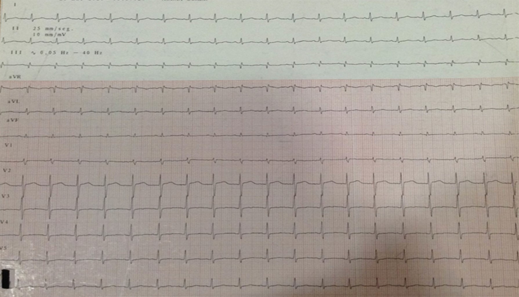 El ECG es anormal en la mayoría de los pacientes con miocardiopatía de estrés (> 95%),17 por lo general muestra cambios isquémicos del segmento ST y de la onda T.16,17 La inversión de la onda T, a menudo profunda y generalizada, y la prolongación significativa del QT, que generalmente se desarrolla de 24 a 48 horas después del inicio de los síntomas o del desencadenante estresante, son bastante específicas de la miocardiopatía por estrés y representan uno de los puntos de evaluación en los criterios de InterTAK.22 La elevación del segmento ST que involucra derivaciones precordiales también se observa sólo en aproximadamente 40% de los casos,18 suele ser más evidente en las derivaciones precordiales V3-V6. La magnitud de la elevación del segmento ST y el número de derivaciones que muestran este patrón suele ser menor en los pacientes con MT que en los casos de infarto de miocardio con elevación del ST.23 Kosuge y colaboradores encontraron que la combinación de depresión del segmento ST en aVR y la ausencia de elevación del segmento ST en V1 podría revelar MT con 91% de sensibilidad, 96% de especificidad y 95% de precisión predictiva.24 La depresión del segmento ST es poco común, ocurre en < 10% de los pacientes.9,22 Para distinguir entre MT anterior e IM, el ECG no debe revelar cambios recíprocos y ondas Q con la relación de elevación del ST en las derivaciones V4-6 a V1-3 > 1, y también la ausencia de depresión del ST o después de una elevación del ST inferior.25