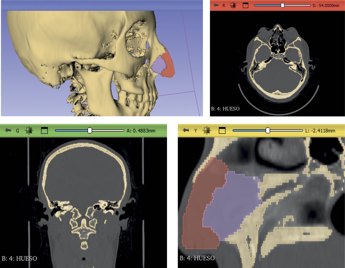 Utilizamos el software de 3D slicer, donde importamos el archivo DICOM para hacer la renderización de volúmenes y usar la técnica de segmentación manual para seleccionar el septum, septum útil y L-strut de seguridad. Seleccionamos el septum y dejamos una "L" para mantener la estructura de la nariz según todas las recomendaciones de rinoplastia. La segmentación la realizamos ajustando el volumen de renderización bajo límites, para hueso y piel. Posteriormente, con segmentación manual, seleccionamos el tamaño del septum; utilizamos las herramientas de medición.16-21