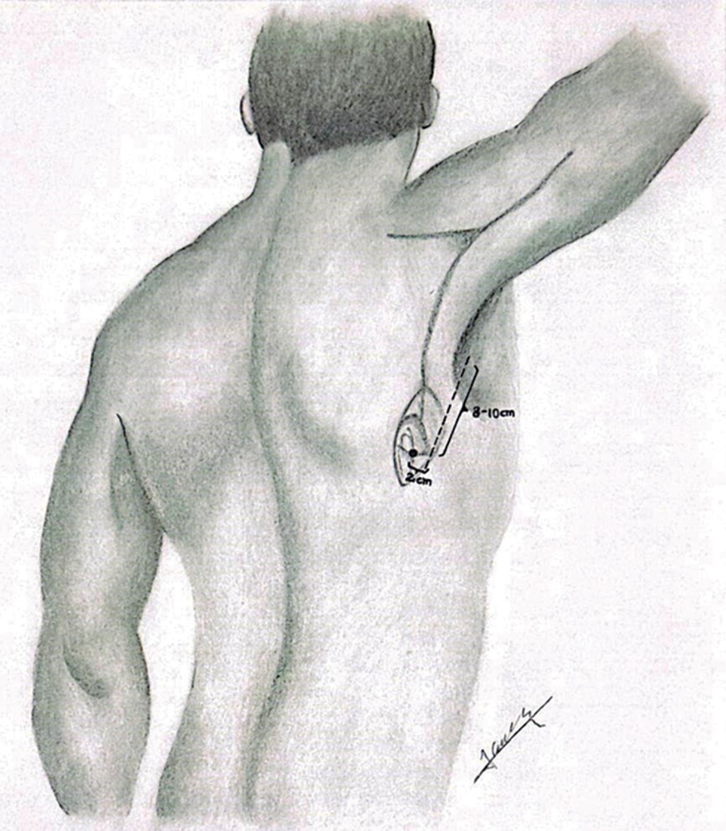 Se coloca al paciente en decúbito lateral, se abduce el hombro a 90° y se identifica mediante palpación el borde lateral del músculo dorsal ancho. Esta posición hace que el trayecto de las perforantes sea más perpendicular al plano cutáneo, facilitando así su identificación mediante ultrasonido Doppler.3 En la espalda del paciente se realiza el marcaje de la perforante a 8 cm del pliegue axilar posterior y a 2 cm posterior al borde lateral del músculo dorsal ancho; este punto representa la localización de la perforante2 (Figura 1). Sin embargo, para tomar en cuenta la posibilidad de la rama cutánea directa que está ubicada muy próxima, se marca este punto con una circunferencia de 2-3 cm de diámetro, la cual se debe incluir dentro del diseño del colgajo.6 El eje longitudinal del colgajo se determina con relación a la prueba de pellizco de la espalda y a los deseos de la localización de la cicatriz donadora (vertical y horizontal). Las dimensiones del colgajo pueden ser de 25 × 15 cm.2