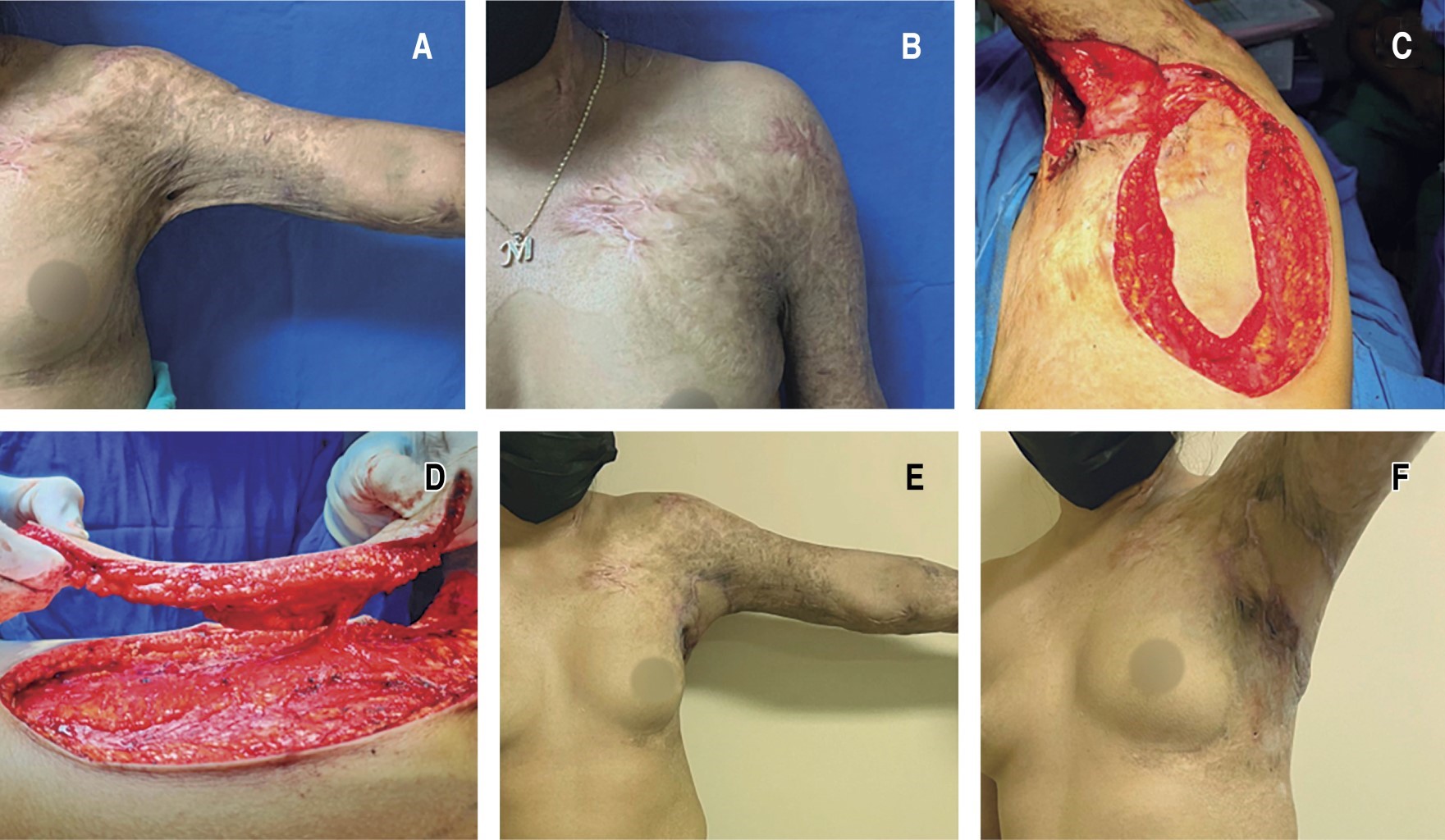Caso 1. Mujer de 27 años con diagnóstico de cicatriz retráctil en axila izquierda como secuela de quemadura por ignición, lo que ocasiona limitación en la abducción del hombro. Se realizó liberación de la cicatriz hasta lograr una adecuada abducción del hombro, y se diseñó el colgajo TDAP con relación al área cruenta residual, de aproximadamente 10 × 15 cm. Después de disecar la perforante y levantar el colgajo, se rotó la isla de piel en propela a 90°, logrando adecuada cobertura cutánea. Se realizó cierre directo del área donadora de colgajo. La evolución postoperatoria fue favorable, sin complicaciones. El seguimiento a los cuatro meses nos muestra una reconstrucción con adecuada calidad de piel en axila sin limitación funcional y una adecuada capacidad para la abducción completa del hombro (Figura 2).