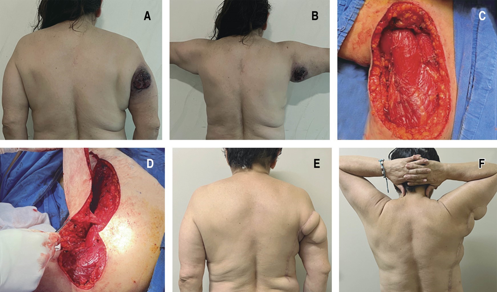 Caso 2. Mujer de 60 años con diagnóstico de carcinoma de células de Merkel en superficie posterior de tercio proximal de brazo derecho. Posterior a la resección amplia por oncología, con área cruenta residual de 15 × 17 cm, se diseñó un colgajo con isla cutánea de dichas dimensiones. Después de la disección de la perforante, se rotó el colgajo en propela a 110°, logrando adecuada cobertura cutánea. El área donadora de colgajo se manejó con cierre primario, sin presentar complicaciones. El seguimiento a los 10 meses de la operación nos muestra una adecuada movilidad del hombro, sin limitación funcional. Sin otras complicaciones (Figura 3).