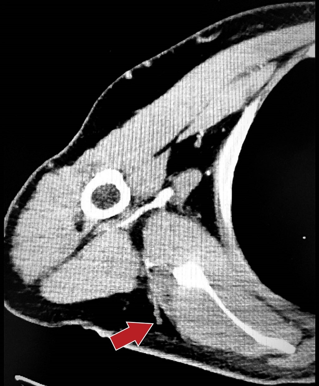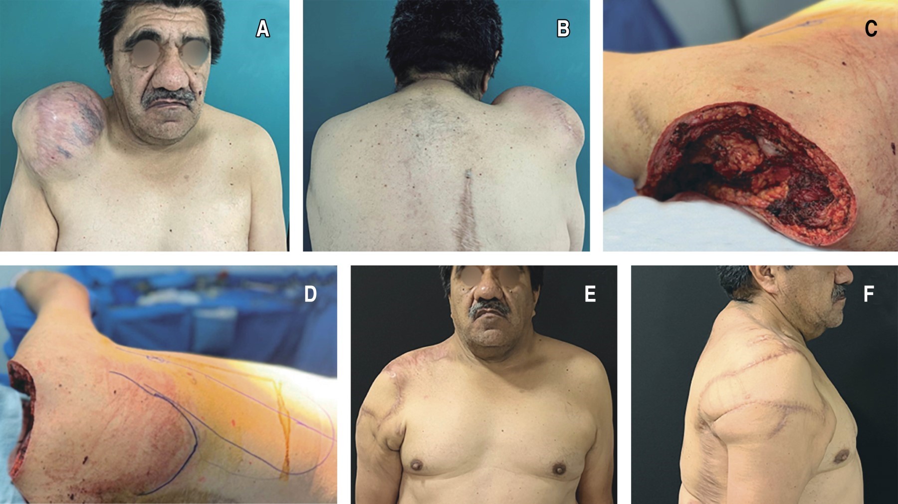 Caso 3. Hombre de 53 años con diagnóstico de sarcoma fibromixoide en hombro derecho, antecedente de una resección amplia previa, el cual fue reconstruido con colgajo de trapecio. Se realiza mapeo de perforante con tomografía computarizada contrastada y ultrasonido Doppler (Figura 4). Posterior a la resección amplia y procedimiento de Tikhoff-Linberg por cirugía oncológica, se observa un área cruenta de 20 × 20 cm en el hombro, con exposición parcial de articulación acromioclavicular y escápula. Se levanta colgajo de 15 × 20 cm para reconstrucción de la superficie más lateral de defecto; en el resto del defecto medial y el área donadora de colgajo, se realizó cierre primario. Después de la disección del colgajo TDAP se realizó su rotación en propela a 180°. Durante el seguimiento el paciente desarrolló dehiscencia de 1 cm en el área donadora, la cual cicatrizó por segunda intención. El seguimiento a siete meses demuestra una limitación funcional del hombro para la abducción debido al procedimiento de Tikhoff-Linberg; sin embargo, el paciente es capaz de realizar sus actividades cotidianas. Sin otras complicaciones (Figura 5).