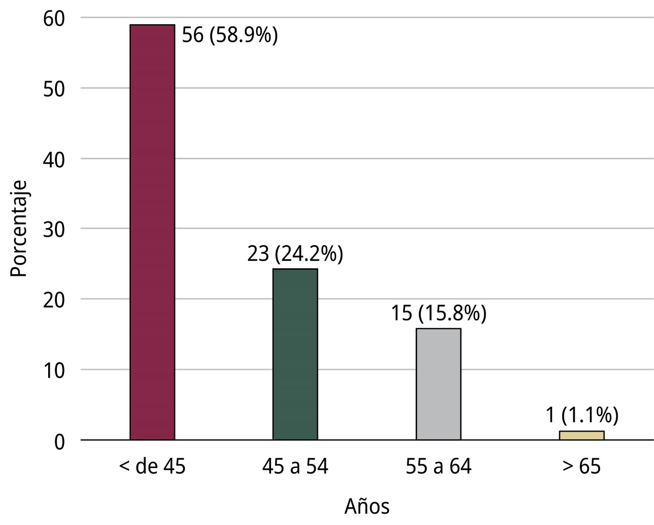 De un total de 124 trabajadores de CMF ISSSTE León, 95 (76%) participantes cumplieron con los criterios de inclusión; 29 (30.5%) correspondieron al género masculino y 66 (69.5%) al femenino. La edad de los participantes fue mayor de 20 años, los cuales se agruparon en los siguientes cuatro rangos de edad de acuerdo con la prueba de Findrisk: 20-44, 45-54, 55-64 y mayores de 65 años (Figura 1).