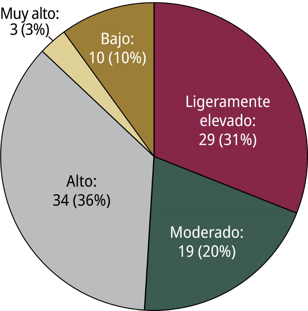En un estudio previo realizado en la Unidad de Medicina Familiar No. 53 del Instituto Mexicano del Seguro Social (IMSS) en León, Guanajuato, durante el año 2023, López y colaboradores11 reportaron que 36% de los 77 participantes, presentaron riesgo ligeramente elevado y 17% riesgo moderado; resultados que son similares a los de nuestro estudio para estas categorías, con 31 y 19%, respectivamente. No obstante, identificamos porcentajes mayores en los niveles de riesgo alto y muy alto en comparación con el estudio referido. Estas discrepancias podrían atribuirse a características específicas de la población evaluada en nuestra serie, como mayor índice de masa corporal, mayor circunferencia abdominal, antecedentes heredofamiliares de enfermedades metabólicas y menor nivel de actividad física.