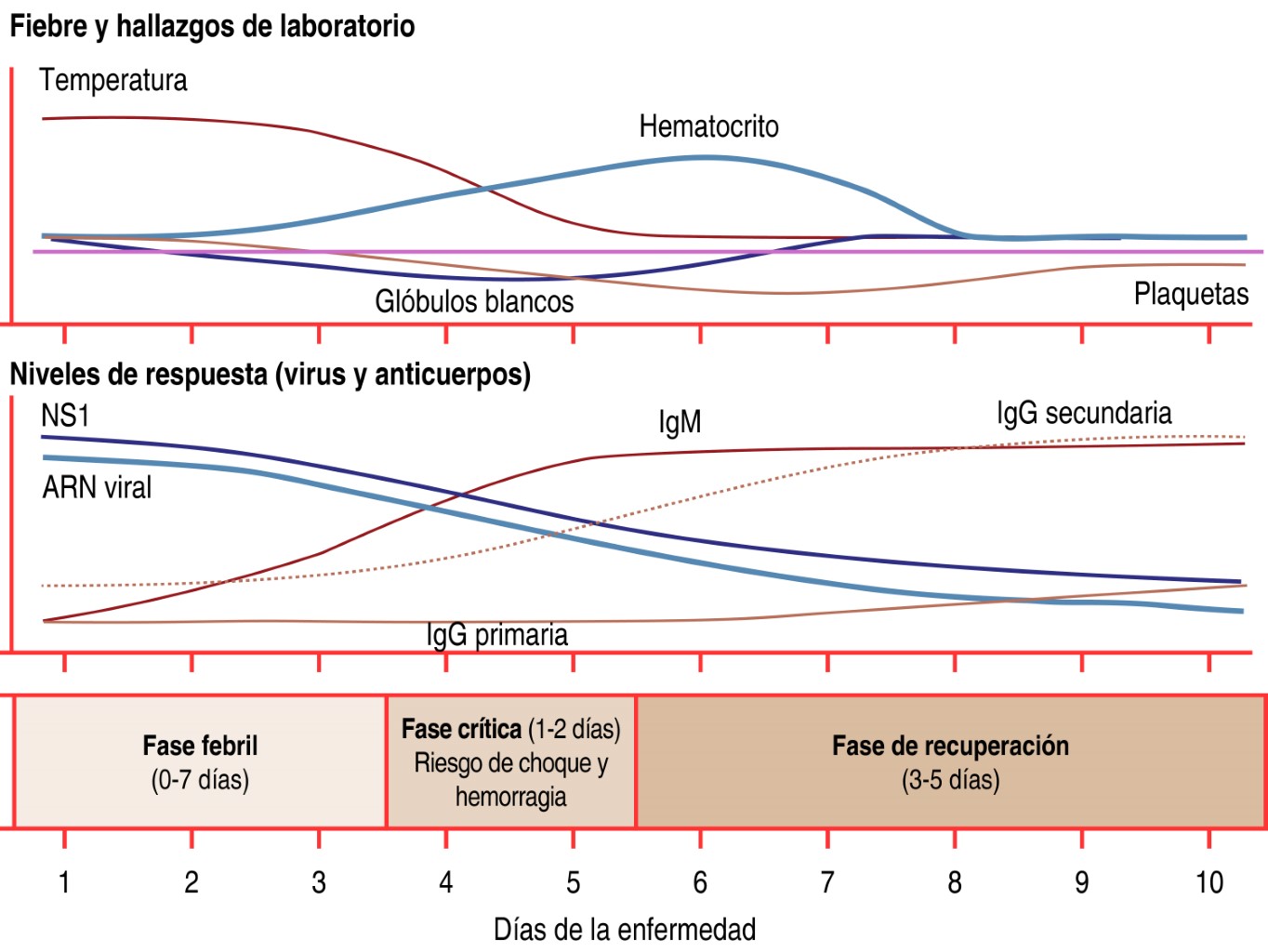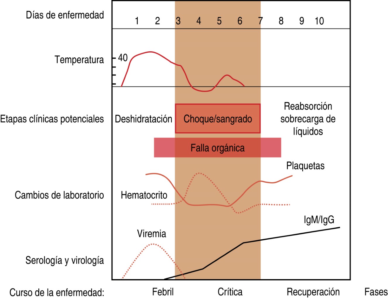 El dengue es una enfermedad febril aguda cuyo cuadro clínico suele ser inespecífico. Entre 60 y 80% de los casos son asintomáticos o subclínicos, lo cual es más frecuente en infecciones secundarias, especialmente si el intervalo de tiempo con la infección anterior es prolongado.13 Los síntomas generalmente se presentan a lo largo de tres fases: febril, crítica y de convalecencia.