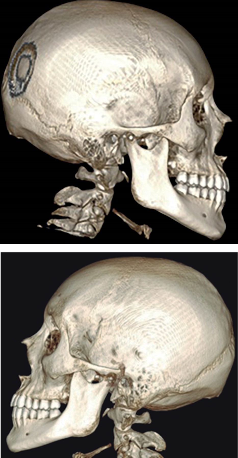 Debido a que nuestro hospital no cuenta con la aparatología necesaria para realizar una artroscopia, se opta por la reposición discal con cirugía abierta y eminectomía. El paciente ingresó a quirófano, el procedimiento se efectuó bajo anestesia general balanceada, con intubación orotraqueal. Se realizó abordaje preauricular tipo Rowe, que permitió exponer de manera adecuada las superficies articulares (Figura 5). Una vez identificada la cápsula, se accedió al espacio articular superior y se procedió a la exposición del disco. Ambos discos articulares, derecho e izquierdo, fueron reposicionados en su ubicación funcional. Para garantizar la estabilidad de los discos, se utilizaron minitornillos de titanio autoperforantes, sobre los cuales se fijaron mediante sutura no reabsorbible (Prolene 2-0). De forma complementaria, se practicó una eminectomía bilateral y remodelado condilar, con el fin de mejorar la relación cóndilo-disco y prevenir recidivas funcionales. La cirugía concluyó con lavado abundante de la zona y cierre por planos (Figura 6).