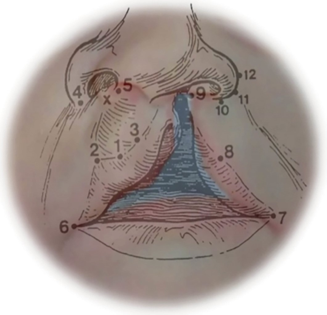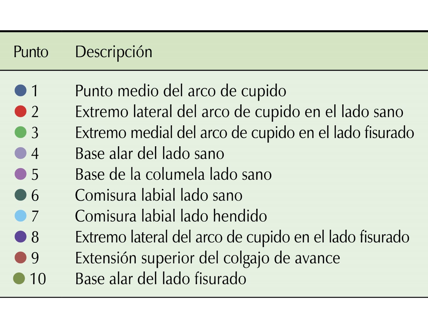 Se utilizó una cámara fotográfica de 35 mm con un objetivo macro de 100 mm para evitar deformaciones faciales; se usó una escala vertical dividida en segmentos de 1 centímetro para obtener mediciones a tamaño real (1:1); los registros se tomaron en vista frontal y a 15° en sentido horizontal y vertical con la cabeza en reposo y los labios relajados. Los registros fotográficos se digitalizaron y se identificaron los puntos de referencia (Figuras 1 y 2). Posteriormente, bajo anestesia general, se ubicaron los puntos anatómicos de acuerdo con lo descrito por Ralph Millard ( Tabla 1) e identificados en la fotogrametría (Figuras 3 y 4). Por medio de microscopio electrónico se realizaron incisiones de acuerdo con la técnica planteada, disección de planos y sutura de mucosa oral y muscular (Figura 5).