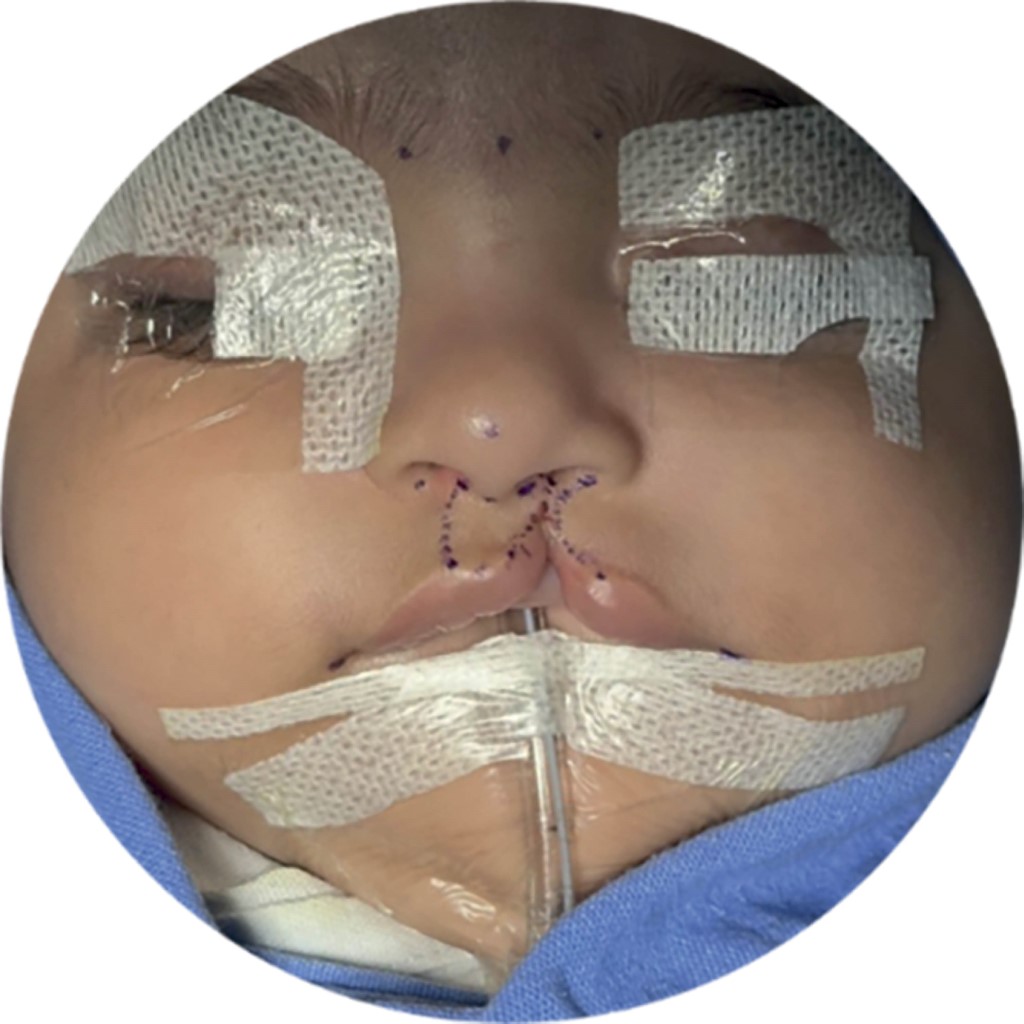 Se trata de paciente masculino de tres meses con diagnóstico de labio hendido unilateral incompleto izquierdo. A la exploración física se aprecia punta nasal con desviación a la derecha, cartílago alar izquierdo rotado, fosa nasal izquierda más amplia, bermellón incompleto y mayor grosor de mucosa labial izquierda.
