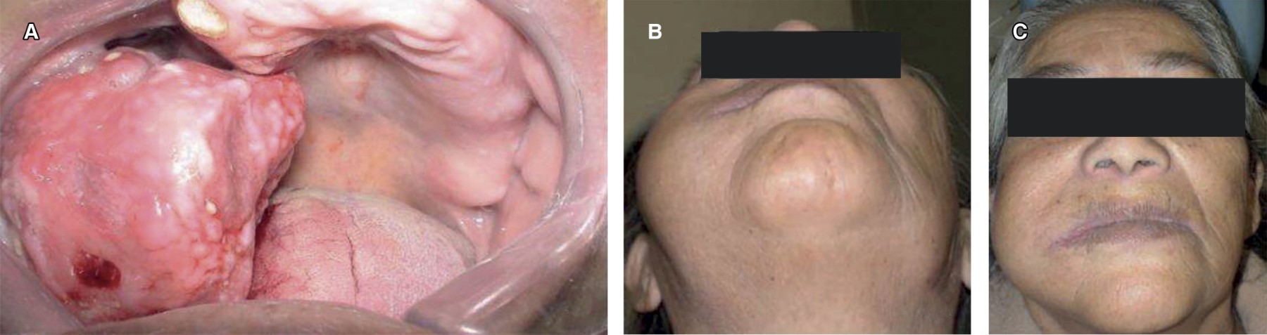 Paciente femenino de 50 años de edad que acude a consulta al servicio de Cirugía Maxilofacial en el Hospital "Luz González Cosío" con osteoartritis y fibromialgia de 15 años de evolución, en tratamiento farmacológico. Presenta un aumento de volumen de 10 × 5 cm con 10 años de evolución, localizado en el reborde alveolar superior. Antecedentes médico-familiares: diabetes mellitus tipo 2 (DM2) por línea materna.