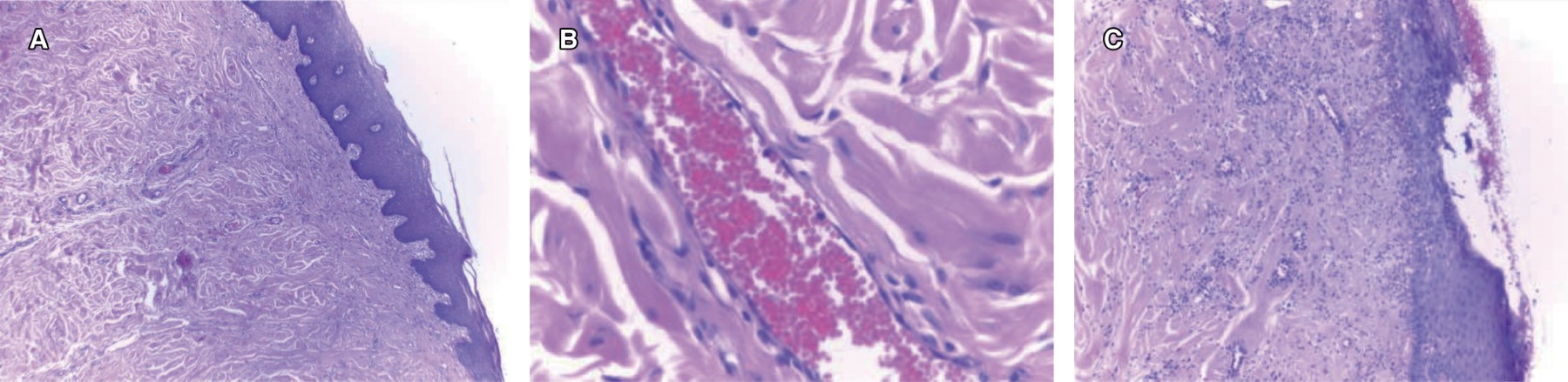 Debido a la inflamación persistente, la epidermis exhibe hiperqueratosis e hiperplasia. En el tejido conectivo, hay hiperplasia focal de fibroblastos maduros y fibras de colágeno densas, con poca o ninguna infiltración de las células inflamatorias.1
