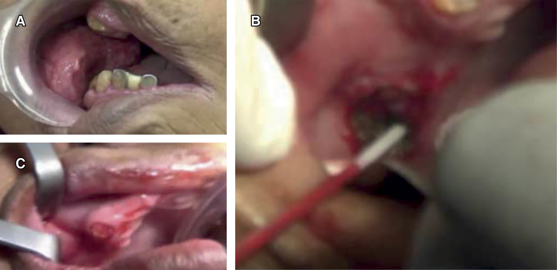 Mediante anestesia general con intubación nasotraqueal, previa asepsia y antisepsia de la región peribucal con yodopovidona, así como previa colocación de taponamiento orotraqueal y campos estériles, se infiltra lidocaína con epinefrina al 2%; posteriormente se realiza corte con electrocauterio, desprendiendo la lesión desde la base pediculada ubicada en la región alveolar de la arcada superior.