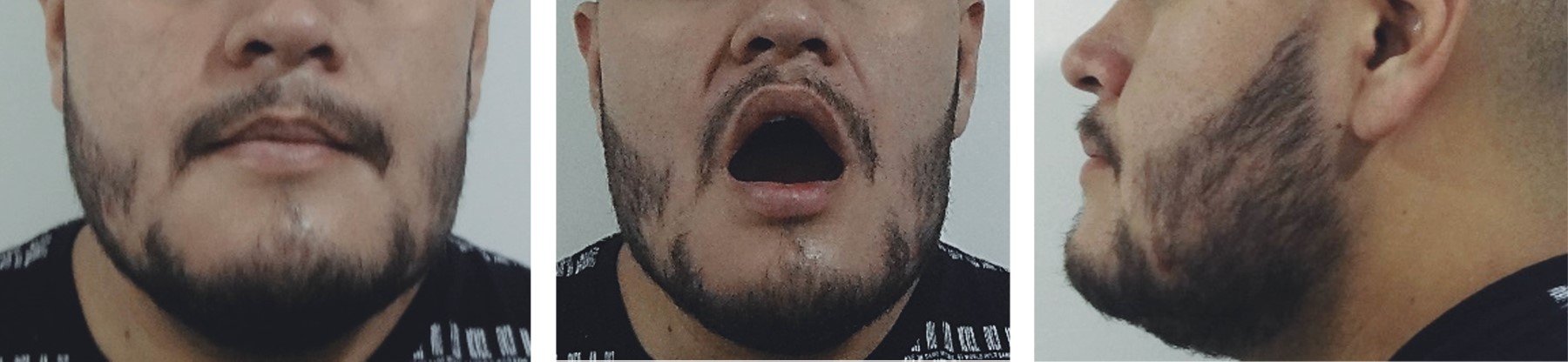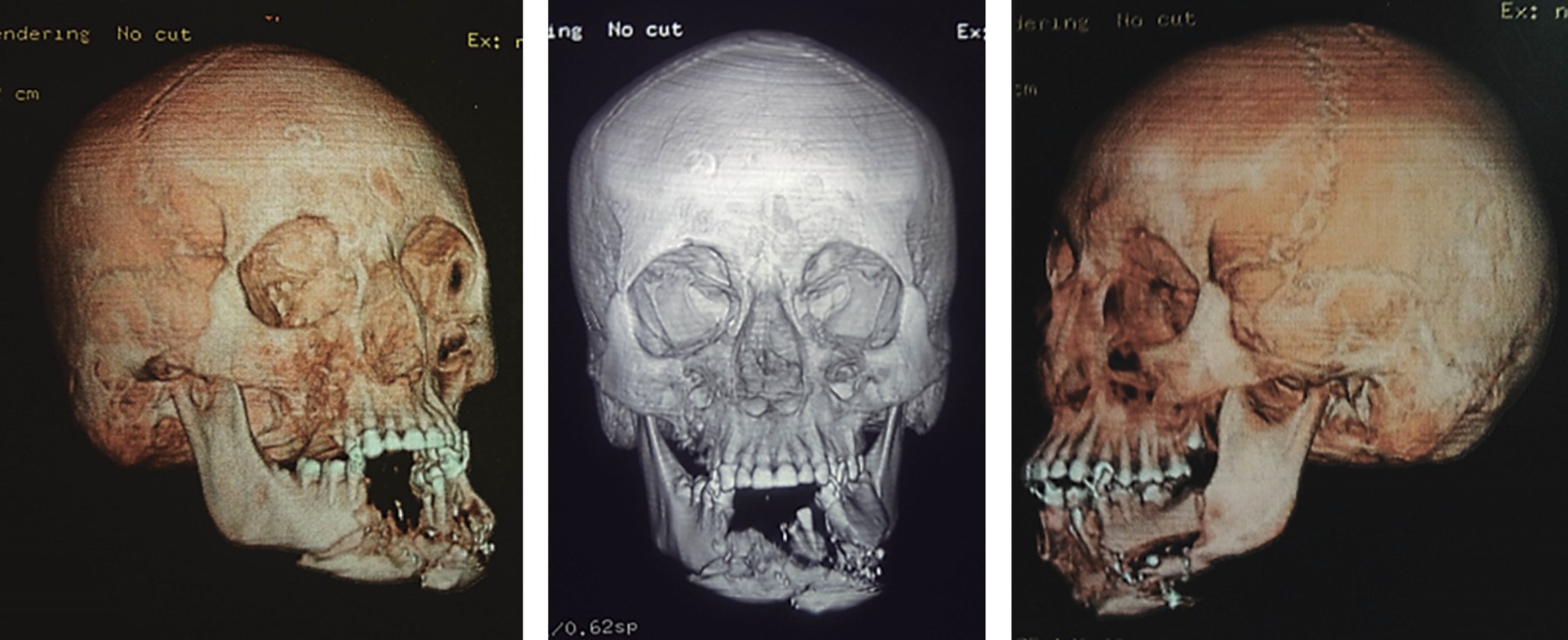 Paciente masculino de 32 años de edad, quien sufrió agresión por terceras personas, recibiendo dos disparos de arma de fuego, uno en sedal en el miembro superior izquierdo y otro en el cuerpo mandibular izquierdo con salida en la región parasinfisiaria derecha que resultó en una fractura conminuta. En el momento de la valoración, el paciente presentaba dos días de evolución; se encontraba consciente y cooperador al manejo, con edema de la región afectada, tejido desvitalizado en la parte anterior del piso de boca, lengua integra, parestesia labial, inestabilidad mandibular, desplazamiento y movilidad de los segmentos óseos y dentoalveolares con pérdida de la oclusión. Se obtuvo una tomografía computarizada con reconstrucción tridimensional en la que se observó una fractura conminuta de la región anterior y del cuerpo mandibular izquierdo (Figura 1).